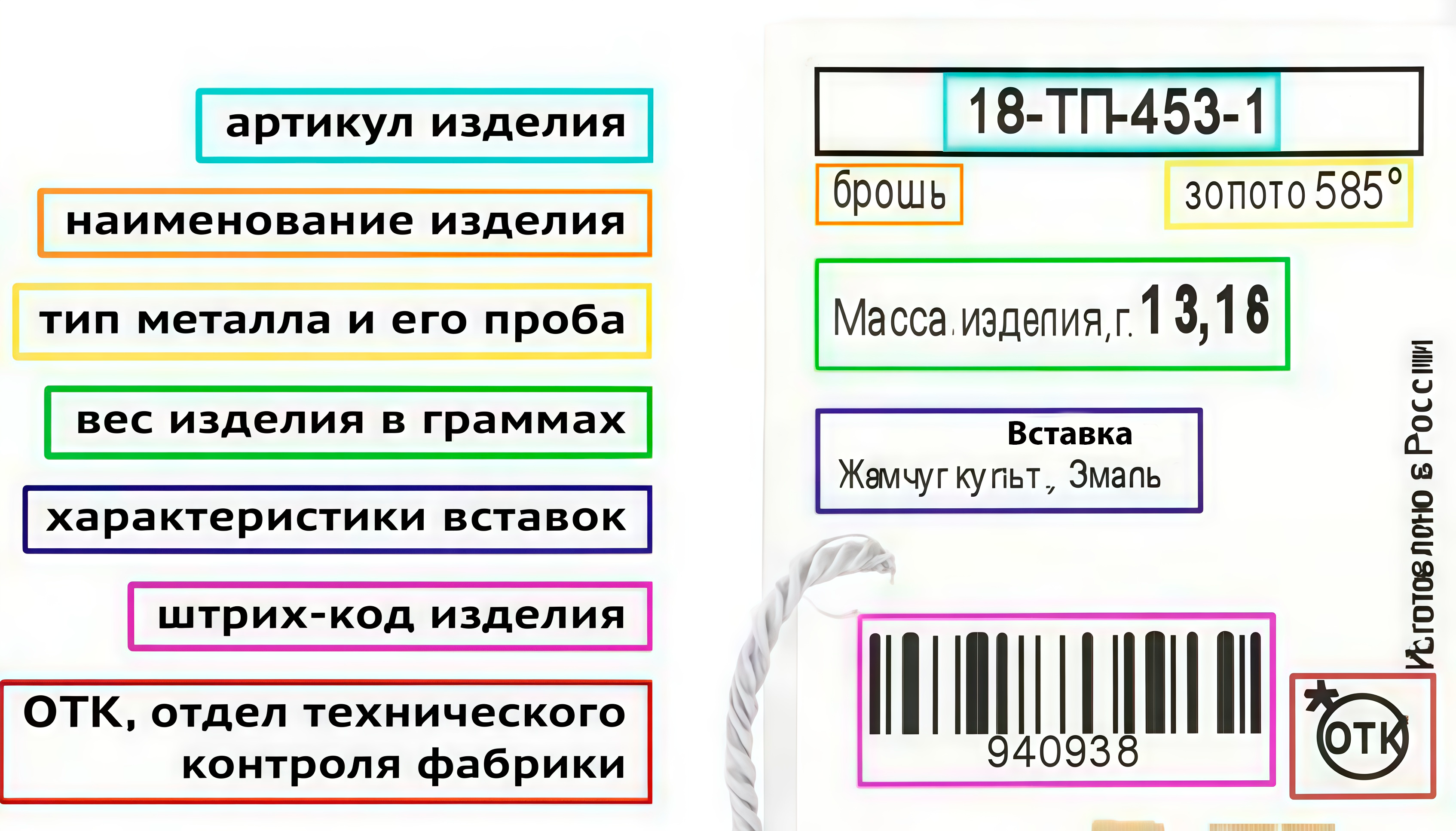 Бирка ювелирного изделия является паспортом украшения и содержит полную информацию о товаре, включая сведения о производителе, материале изготовления, вставках и их характеристиках. Рекомендуем сохранять бирку в течение всего срока эксплуатации изделия.