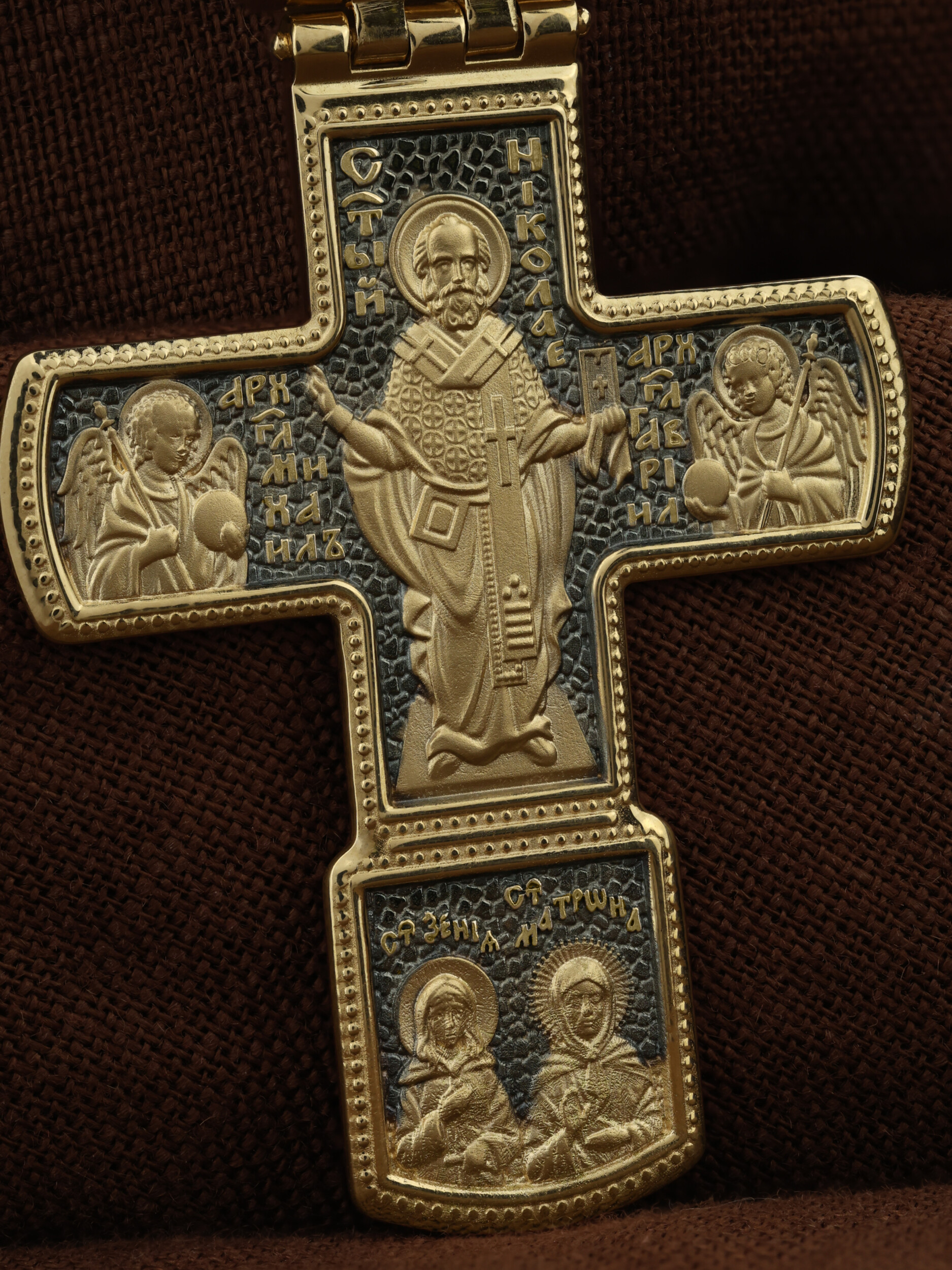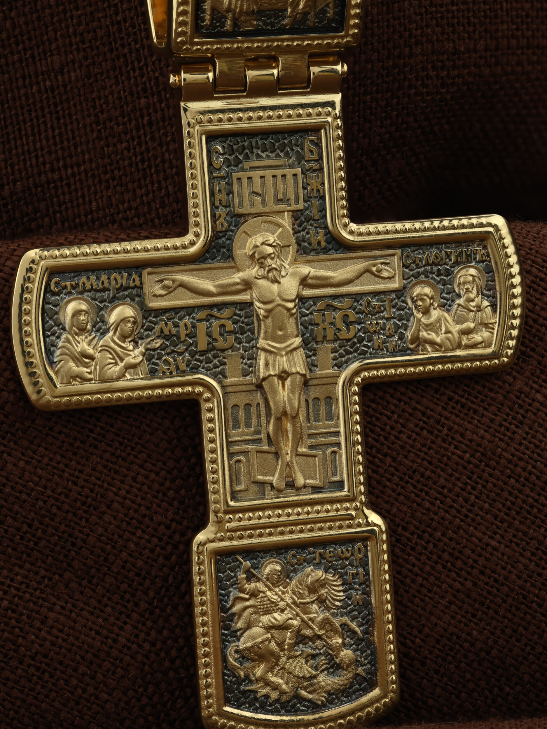 На кресте изображено Распятие Господа нашего Иисуса Христа. Ему предстоят Святая Мария Магдалина, Пресвятая Богородица, апостол Иоанн и Святой Иосиф, свидетели крестных страданий Господа. Вверху — икона Святой Троицы, на которой запечатлено явление Триединого Бога праотцу Аврааму в виде трех ангелов. В нижнем клейме изображено Чудо Святого Георгия о змие. Великомученик Георгий почитается как покровитель воинов, защитник от злых сил, помощник в духовной борьбе.