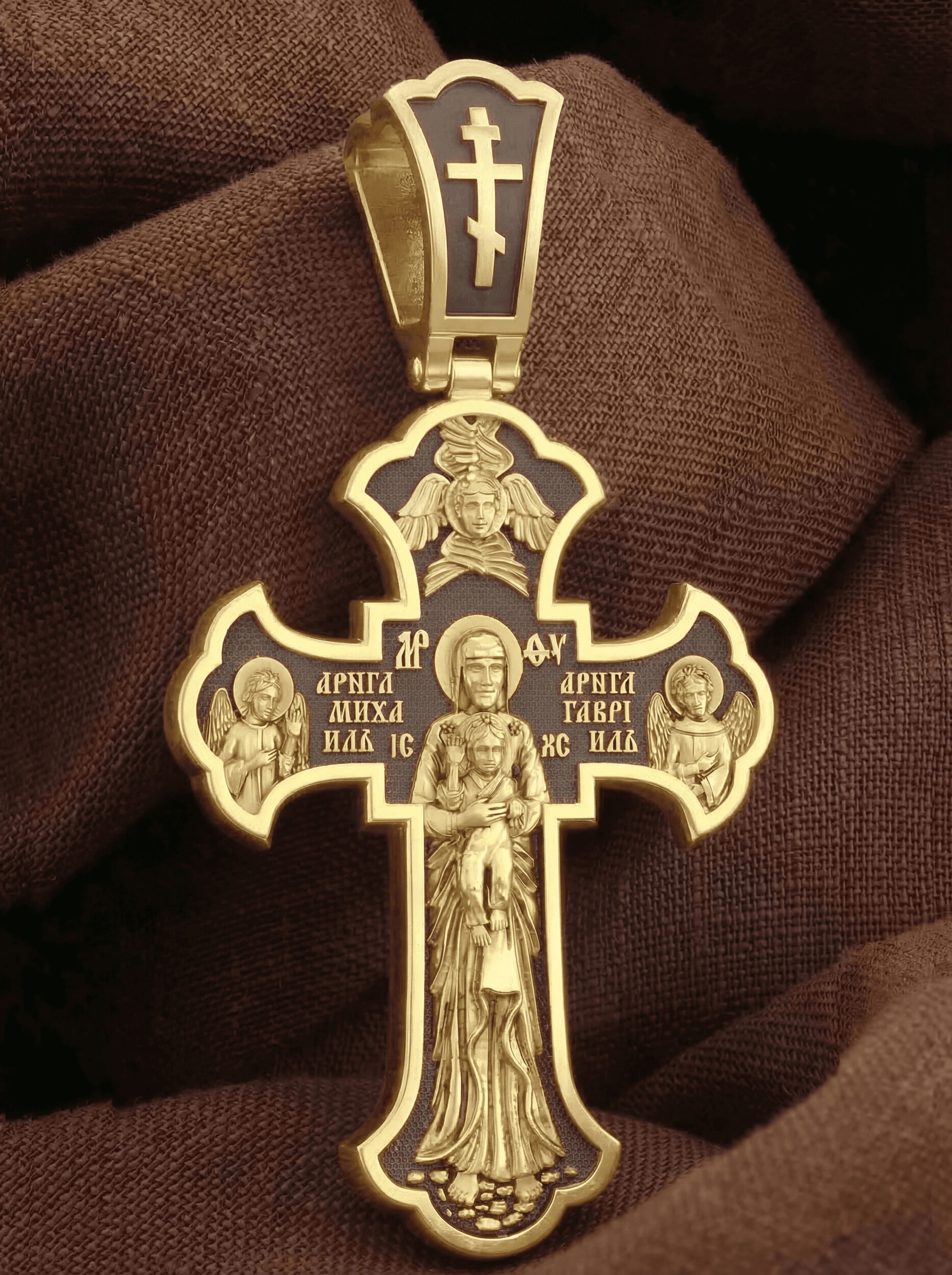 На лицевой стороне этого креста центральную часть занимает икона Распятия Христа — образ жертвы, принесенной Господом за грехи людей. Именно ко Христу, сошедшему на землю ради нашего спасения, возносятся все молитвы. Пресвятая Богородица, ангелы и святые — помощники Господа в деле спасения и заступники за людей перед Богом. «Оружием великим Христовым» именует Церковь крест, потому что, претерпев страдания и умерев, Господь победил смерть и лишил дьявола его власти над миром. Поэтому рядом с титлами Святого имени Христа написано «НИКА», что значит «победитель».
