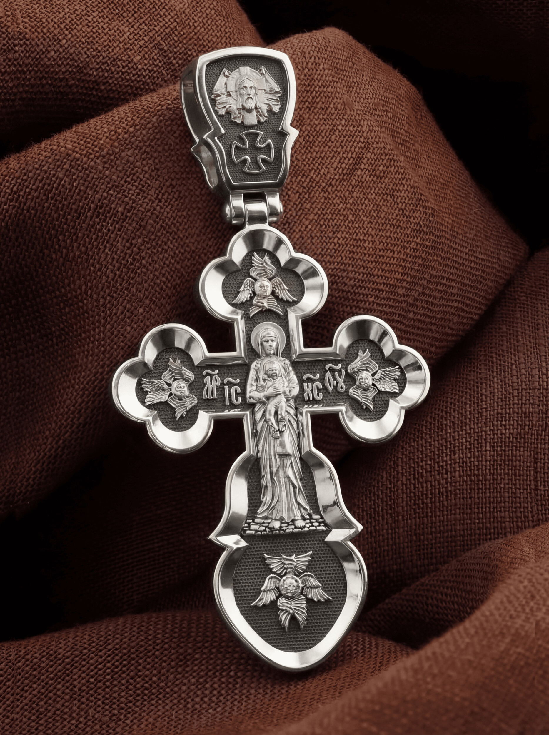 Распятие сопровождается иконографическими надписями, прославляющими Господа Иисуса Христа. На боковых оконечностях размещены инициалы святого имени Спасителя «IС ХС» и надпись «Сын Божий», обозначающая Его божественную природу. На подножии Креста можно прочитать надпись «НИКА» (Победитель) — символ победы Господа над смертью. Венчает лицевую сторону образ Святого Духа в виде голубя.