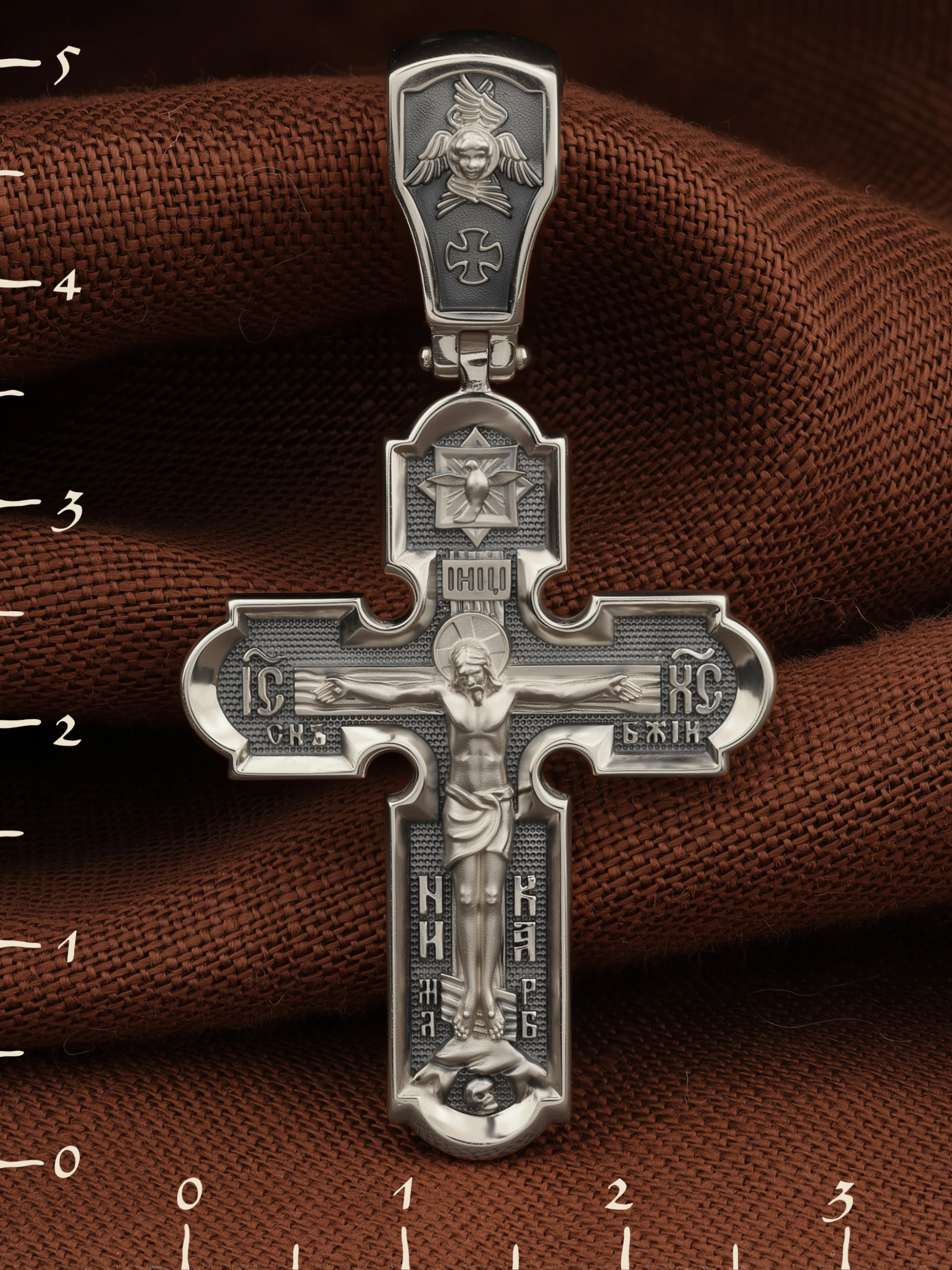 На кресте внизу изображен Ангел Хранитель, слева — Святая Блаженная Ксения, справа — Святая Блаженная Матрона, вверху — пророк, почитающийся в христианстве, Предтеча Господень Иоанн Креститель. На кулонном кольце помещено изображение Спаса Нерукотворного — образ Спасителя, который Он запечатлел на плате и передал для исцеления больному проказой царю Эдессы. Ему придается победное и защитное значение.