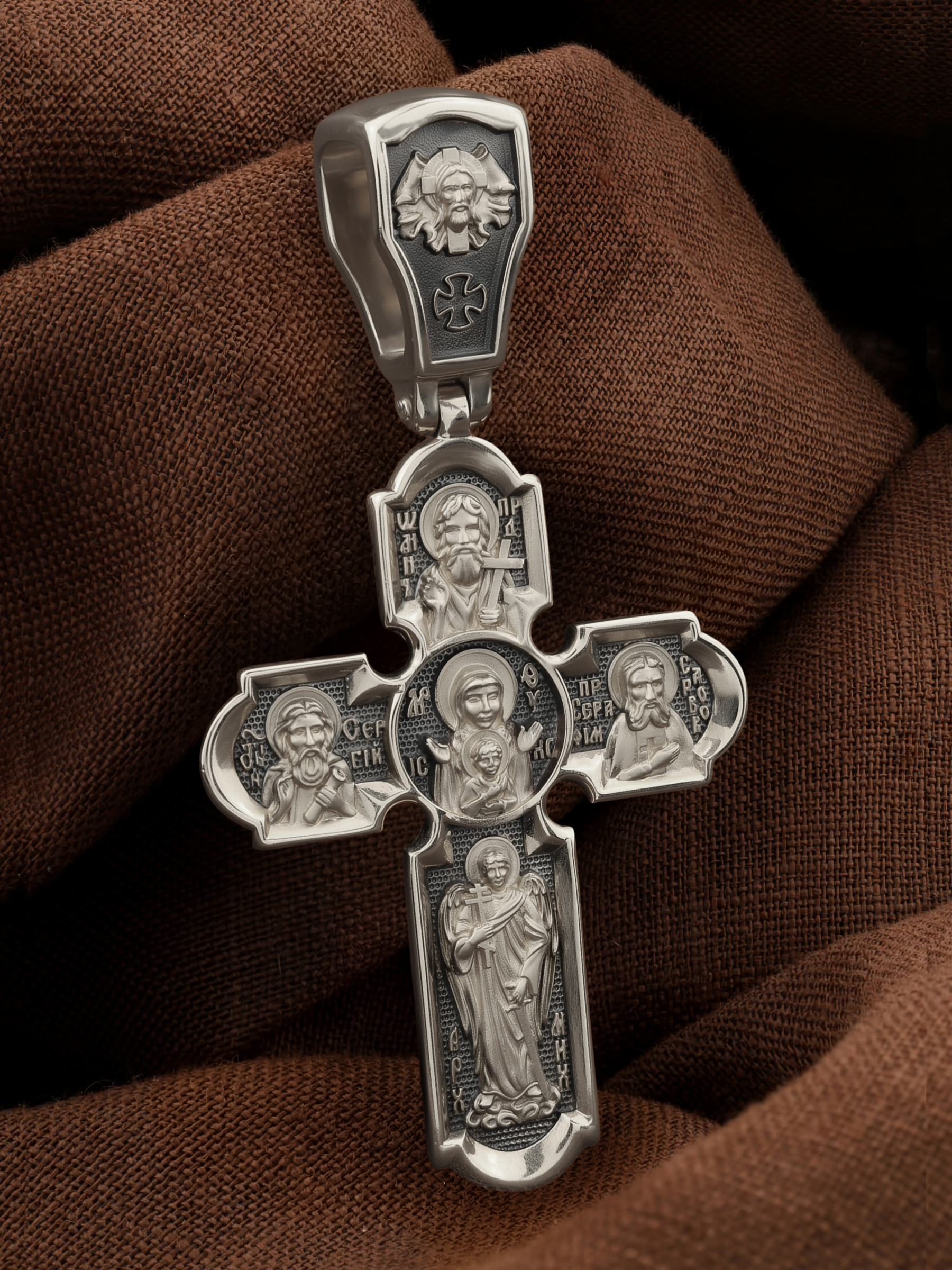 Центральную часть оборотной стороны креста украшает икона Божией Матери «Знамение». Иконы Божией Матери, известные под именем «Знамение», появились на Руси в XI — XII веках, а называться так стали после чудесного знамения от Новгородской иконы, случившегося в 1170 году. Многочисленные списки с иконы Знамения известны по всей России. На кресте внизу изображен Архангел Михаил, слева — Преподобный Сергий Радонежский, справа — Преподобный Серафим Саровский, вверху  — Предтеча Господень Иоанн Креститель. На кулонном кольце помещено изображение Спаса Нерукотворного — образ Спасителя, который Он запечатлел на плате и передал для исцеления больному проказой царю Эдессы. Ему придается победное и защитное значение.