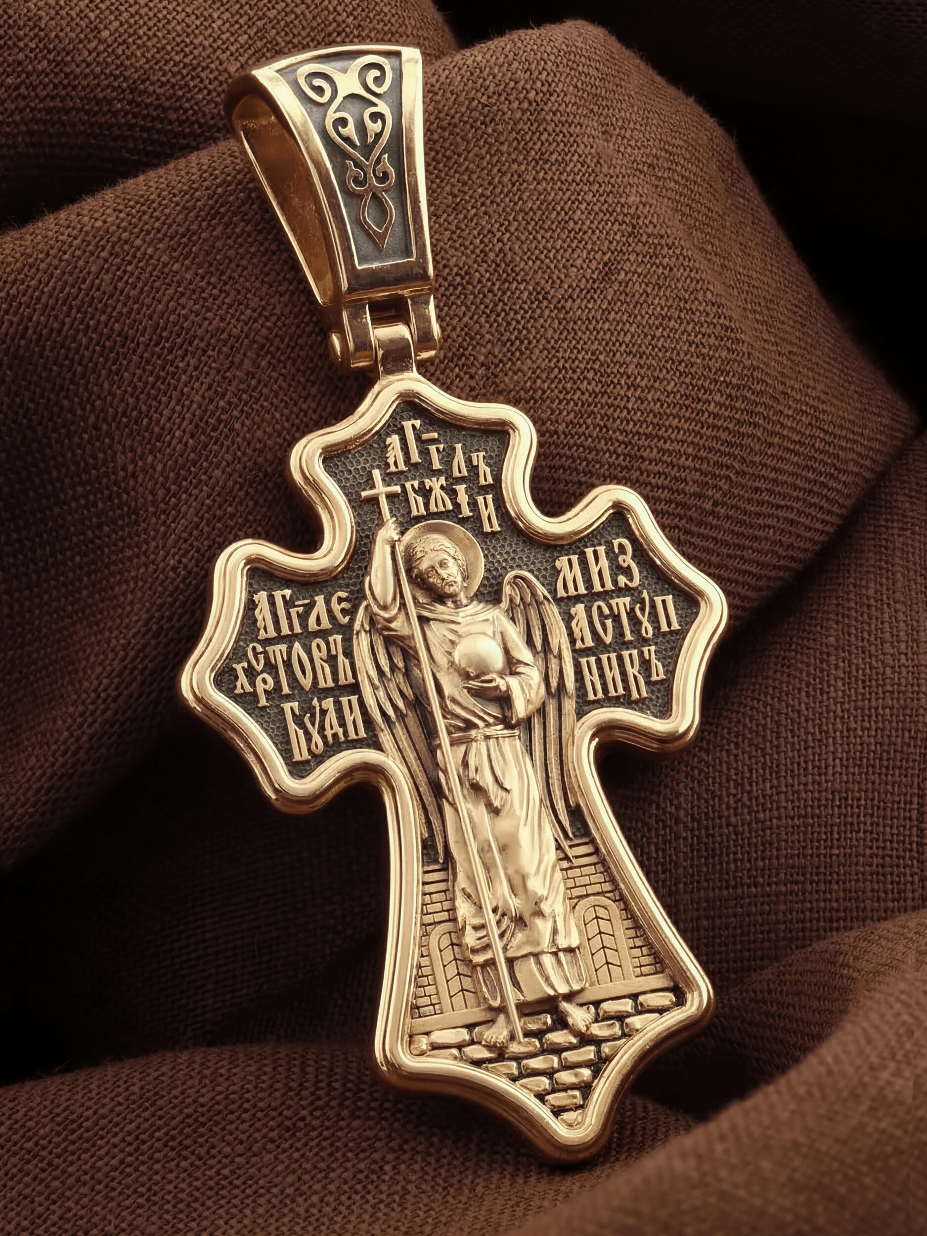 Оборотную сторону креста возглавляет Ангел Хранитель. Он защищает человека от злых духовных и физических нападений. Ангел не может нарушить свободу воли человека, поэтому его надо молитвенно просить о помощи. Вокруг его образа написана молитва: «Ангеле Христов, буди ми заступник».