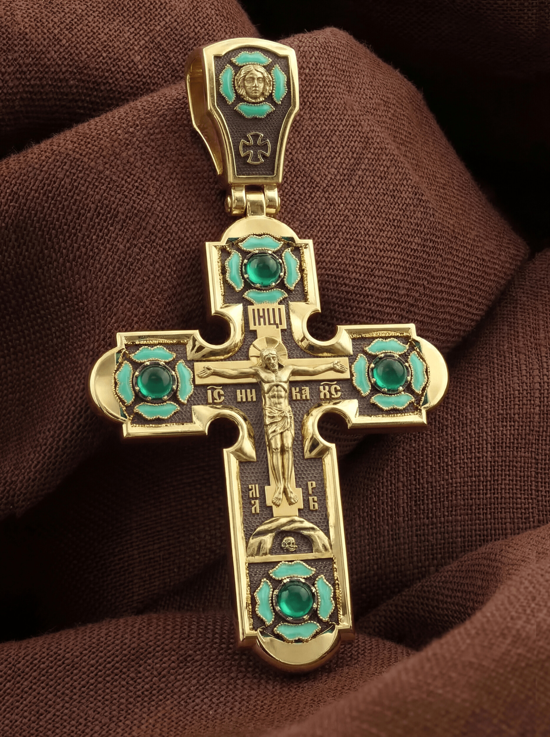 На лицевой стороне креста изображено Распятие Господа и Спасителя нашего Иисуса Христа. Христос, подвергнутый на кресте мучительной казни, своими страданиями искупил нас от древнего греха и даровал нам жизнь вечную. На верхней табличке, выше головы Иисуса, расположена надпись, составленная Понтием Пилатом — «IНЦI». Она означает «Иисус Назорей, Царь Иудейский». Надпись «IС» « ХС» означает Иисус Христос и слово «НИКА», что означает «победитель», помещаются на разных сторонах поперечной перекладины креста. В нижней части креста находится надпись «МЛРБ» — «место лобное рай бысть» означает, что место лобное стало раем. Крест стоит на горе камней, символизирующих Голгофу. Под подножием Креста изображена покоящаяся голова (череп) Адама, грехи которого Христос омыл Своею Кровью. Христос в Своей Божественной любви, над которой смерть не властна и которая, страдая, и не страдает в обычном смысле, простирает к людям со Креста Свои объятия, в которые призывается и привлекается весь мир.