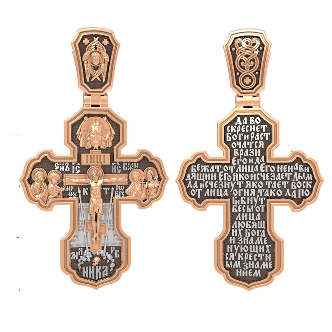 На лицевой стороне креста изображено Распятие Господа и Спасителя нашего Иисуса Христа. Крест- символ спасения и искупления рода человеческого, знамение победы над смертью и адом. Иисус Христос, как искупительная жертва освобождения человечества от власти греха, умер крестной смертью и в третий день воскрес. На верхней табличке, выше головы Иисуса, расположена надпись, составленная Понтием Пилатом — «IНЦI». Она означает «Иисус Назорей, Царь Иудейский». Надпись «IС» « ХС» означает Иисус Христос и помещается на разных сторонах поперечной (большой) перекладины креста. Рядом расположена надпись «Сын Божий». Выше Распятия изображен Нерукотворный образ Господа и Спасителя нашего Иисуса Христа. Слева от Распятия — Пресвятая Богородица и святая мироносица Мария Магдалина с крестом в руке. Справа — апостол и евангелист Иоанн Богослов, один из ближайших учеников Иисуса Христа и сотник Лонгин с крестом в правой руке и копьем — в левой. За крестом высится Иерусалимская стена. Крест стоит на горе камней, символизирующих Голгофу. В ее основании различается череп — это голова Адама. Вдоль креста изображены копие сотника Лонгина и трость с губкой и буквы «К» и «Т». Надпись «МЛРБ» — «место лобное рай бысть» означает, что место лобное стало раем и помещаются в нижней части креста. Рядом — слово «НИКА», что означает «победитель». На православном кресте Христос не умирает, а свободно простирает руки, ладони Иисуса открыты, будто он хочет обнять все человечество, даря им свою любовь и открывая путь к вечной жизни. На кулонном кольце изображен шестикрылый Серафим.