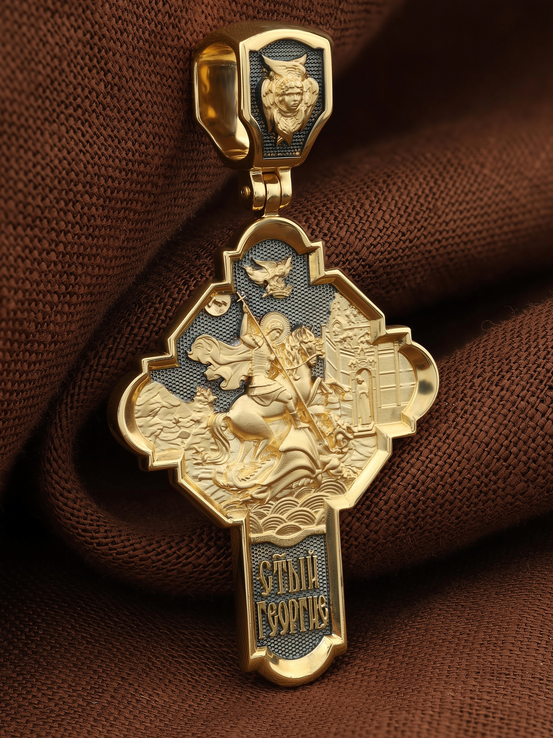 На оборотной стороне креста помещено изображение Святого Великомученика Георгия Победоносца — одного из самых почитаемых и удивительных святых. Георгий родился в Каппадокии (Малая Азия) в семье богатых и знатных горожан. Юношей поступил на службу к римскому императору Диоклетиану, за отличное знание военного дела и проявленную в боях и походах храбрость был приближен к императору и удостоен высокого воинского звания. Во время начавшихся гонений на христиан, перешел на сторону гонимых и, отвергнув человеческий страх, стал ярым проповедником учения Христа. Мучители подвергли опального воеводу жесточайшим восьмидневным пыткам и казнили его (обезглавили) в возрасте около тридцати лет в 303 году. Георгий изображен как воитель, сидящий на вздыбленном коне и поражающий копьем огнедышащего змея. Слева над образом изображена благословляющая Божия десница. Над святым изображен ангел возлагающий на него венец мученика. Змей символизирует собою сатанинские силы. Молитвами вознесенными к Всевышнему и своей непреклонной верой он смог одолеть чудовище. Святой убил змея, спас царскую дочь, принесенную в жертву, и жителей города, их души от влияния дьявола, породив в них надежду и веру в Господа, призывая людей принять христианскую веру. На кулонном кольце изображен шестикрылый Ангел — Серафим.