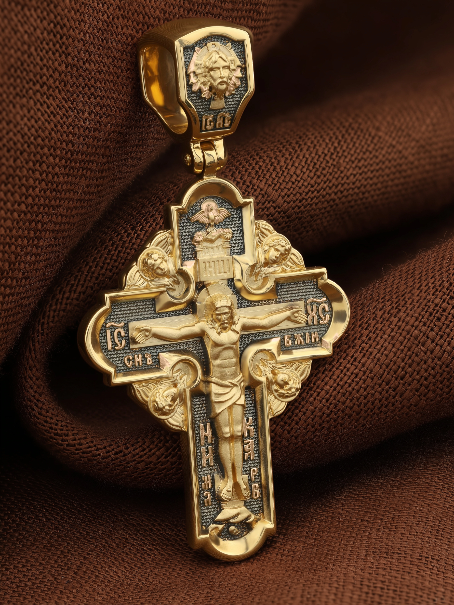 На лицевой стороне креста изображено Распятие Господа и Спасителя нашего Иисуса Христа. Крест- символ спасения и искупления рода человеческого, знамение победы над смертью и адом. Верхняя перекладина символизирует титло — табличку, на которой, согласно Евангелию, было начертано: Иисус Назорей Царь Иудейский (IНЦI). Надпись «IC» «ХC», означает Иисус Христос, помещается на разных сторонах поперечной перекладины креста. Ниже перекладины расположено словосочетание «СЫН БОЖИЙ», что означает божественную природу Иисуса Христа. Надпись «МЛРБ» — «место лобное рай бысть» означает, что место лобное стало раем и помещаются в нижней части креста. Рядом — слово «НИКА», что означает «победитель». Возвышение, на котором стоит Крест, символизирует гору Голгофу, на которой произошло Распятие. Под подножием Креста изображена покоящаяся голова (череп) Адама. На кулонном кольце изображен Нерукотворный образ Господа и Спасителя нашего Иисуса Христа, чудесно отпечатавшийся на плате, которым Христос вытер свой лик.