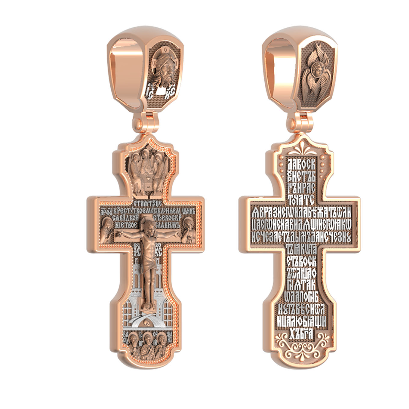 На лицевой стороне креста изображено Распятие Господа и Спасителя нашего Иисуса Христа, отдавшего Себя на смерть, для искупления грехов мира. Крест является символом жертвенной любви Всеблагого Бога к падшим людям, всепобеждающим духовным оружием христиан, основанием и средоточием церковной жизни. Господь сказал: «кто хочет идти за Мною, отвергнись себя, и возьми крест свой, и следуй за Мною». (Мк. 8: 34). Выше Распятия помещены слова молитвы:"Кресту Твоему поклоняемся, Владыко, и святое Воскресение Твое Славим». Над Распятием — образ Святой Троицы в виде трех ангелов. Надпись «IС» « ХС» означает Иисус Христос и находится ниже поперечной перекладины креста. Слева от Распятия изображена Пресвятая Богородица. Справа — апостол и евангелист Иоанн Богослов, один из ближайших учеников Иисуса Христа. За крестом высится Иерусалимская стена. Крест стоит на горе камней, символизирующих Голгофу. В ее основании различается череп — это голова Адама. Ниже распятия изображены отцы Церкви — Святители Василий Великий, Григорий Богослов и Иоанн Златоуст. На православном кресте Христос не умирает, а свободно простирает руки, ладони Иисуса открыты, будто он хочет обнять все человечество, даря им свою любовь и открывая путь к вечной жизни. На кулонном кольце изображен Нерукотворный образ Господа и Спасителя нашего Иисуса Христа, чудесно отпечатавшийся на плате, которым Христос вытер свой лик.