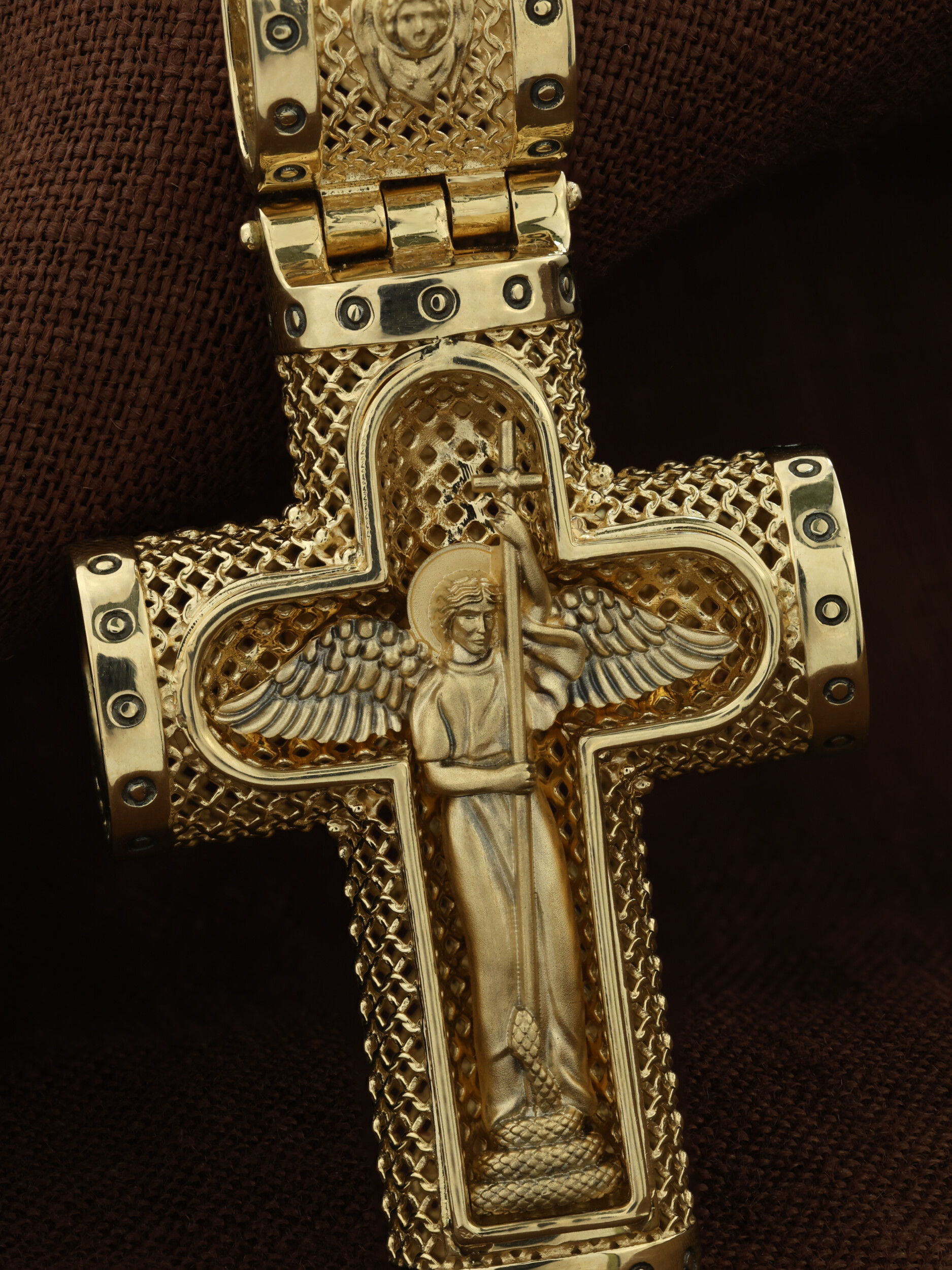 На лицевой стороне креста изображено Распятие Господа и Спасителя нашего Иисуса Христа. Крест- символ спасения и искупления рода человеческого, знамение победы над смертью и адом. Иисус Христос, как искупительная жертва освобождения человечества от власти греха, умер крестной смертью и в третий день воскрес. Распятие сопровождается каноническими надписями. На верхней табличке, выше головы Иисуса, расположена надпись, составленная Понтием Пилатом — «IНЦI». Она означает «Иисус Назорей, Царь Иудейский». Надписи «IC» «ХC», означает Иисус Христос, «НИКА», что означает Победитель, «Царь Славы» и «Сын Божий», размещается на разных сторонах поперечной перекладины креста. Крест стоит на горе камней, символизирующих Голгофу, которая обозначена надписью «Г Г». В ее основании различается череп — это голова Адама, обозначенный надписью «Г А». Надпись «МЛРБ» — «место лобное рай бысть» означает место лобное стало раем. Вдоль креста изображены орудия Страстей Христовых: копие сотника Лонгина, которым пронзили подреберье мёртвого Иисуса, чтобы убедиться в Его смерти, и трость с губкой, с которой Иисуса напоили уксусом. Они обозначены буквами «К» и «Т». На кулонном кольце размещен «Нерукотворный образ Иисуса Христа», на оборотной стороне кулонного кольца- шестикрылый Серафим.