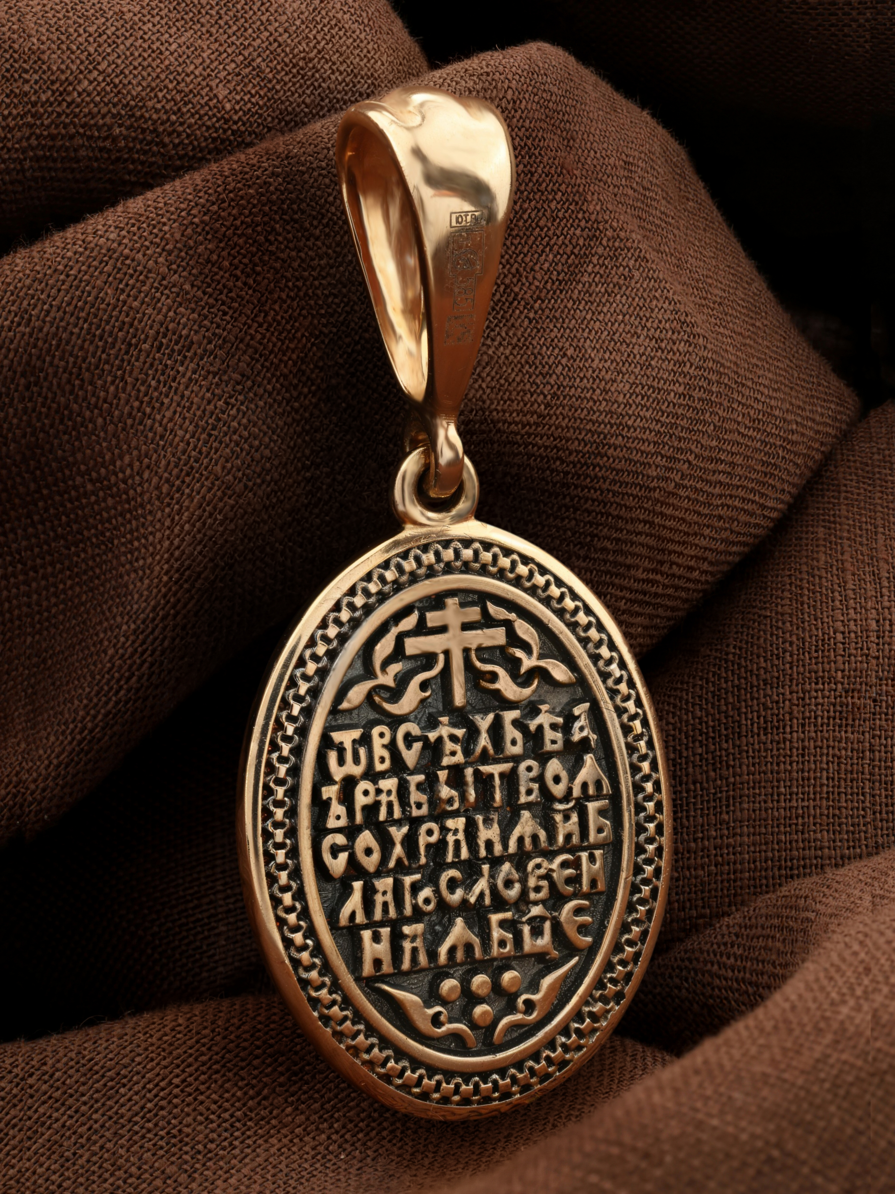 На лицевой части образка изображена Казанская икона Пресвятой Богородицы — одна из самых почитаемых в России. Икона была явлена на пожарище в Казани в 1579 году. В 1904 году святыня была похищена и уничтожена, но чудотворную силу иконы Богородица явила во многих ее списках. Молитва перед Казанской иконой Божьей Матери помогает во всех сложных случаях жизни, во всех печалях, невзгодах, скорбях.