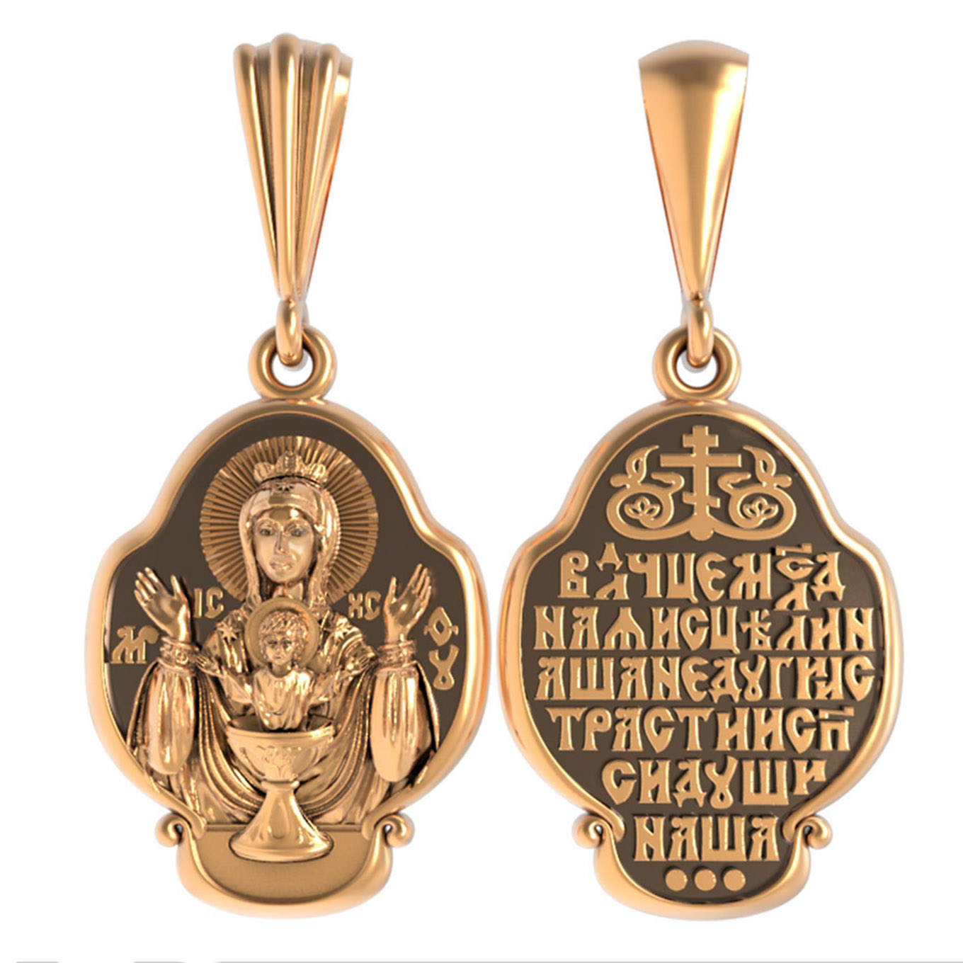 На лицевой части образка изображена икона Божией Матери «Неупиваемая чаша». Икона славится помощью в исцелении зависимостей, помогает людям обрести свободу от греховных страстей.
