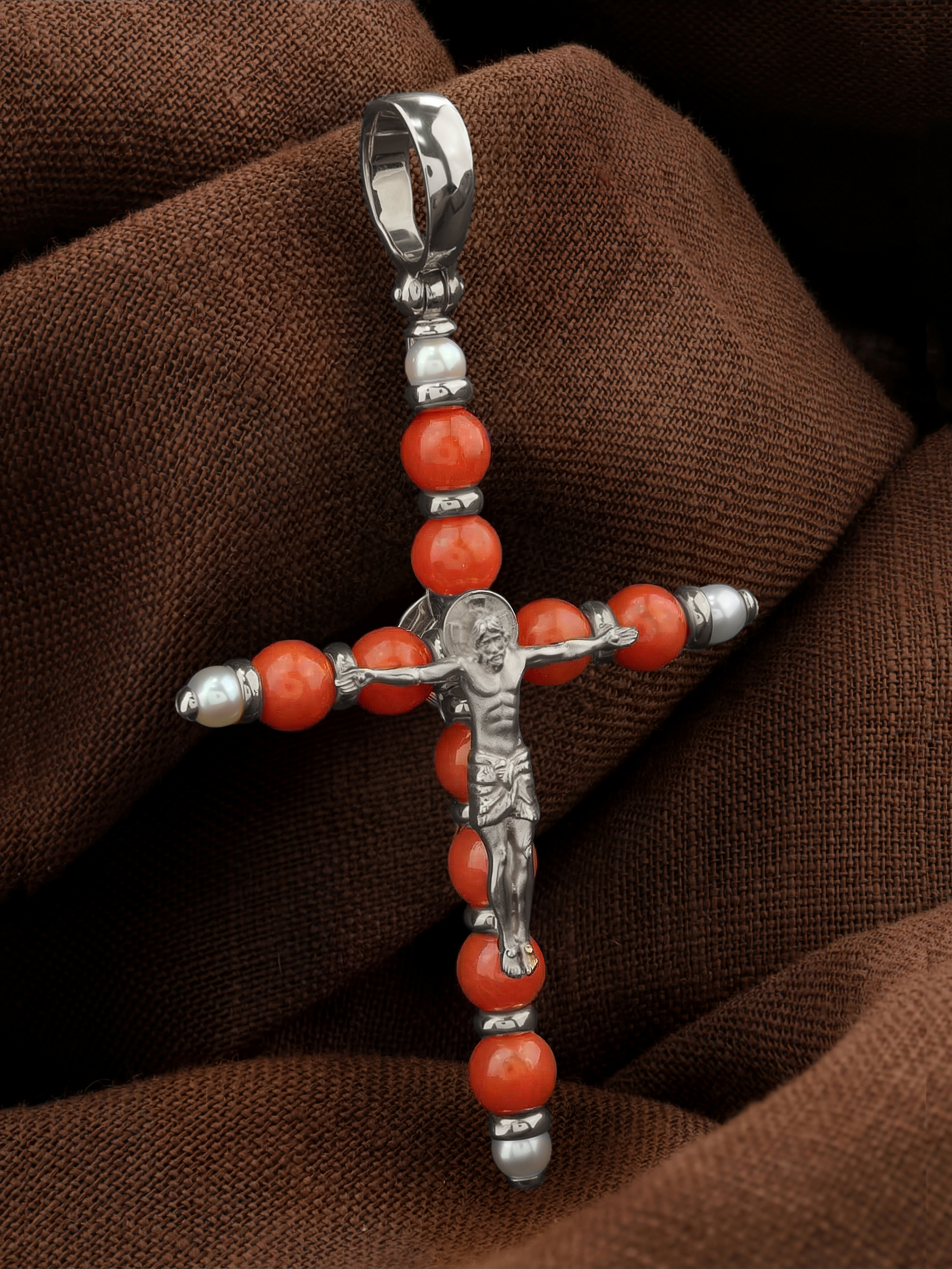 На лицевой стороне креста изображено Распятие Господа и Спасителя нашего Иисуса Христа. Своими крестными страданиями Господь смыл наши грехи, покрыл наш долг перед Богом или, на языке Писания, нас «искупил». В Голгофе сокрыта непостижимая тайна бесконечной правды и любви Бога. Крест стал символом победы добра над злом, жизни над смертью, напоминанием бесконечной Божьей любви, предметом радости. Воплотившийся Сын Божий Своею кровью освятил крест и сделал его проводником Своей благодати, источником освящения верующих. На верхней табличке, выше головы Иисуса, расположена надпись, составленная Понтием Пилатом — «IНЦI». Она означает «Иисус Назорей, Царь Иудейский». Надпись «IC» «ХC», означает Иисус Христос, помещаются на разных сторонах поперечной перекладины креста. Христос в Своей Божественной любви, над которой смерть не властна и которая, страдая, и не страдает в обычном смысле, простирает к людям со Креста Свои объятия, в которые призывается и привлекается весь мир. Поэтому Тело Его не висит, а торжественно покоится на Кресте.