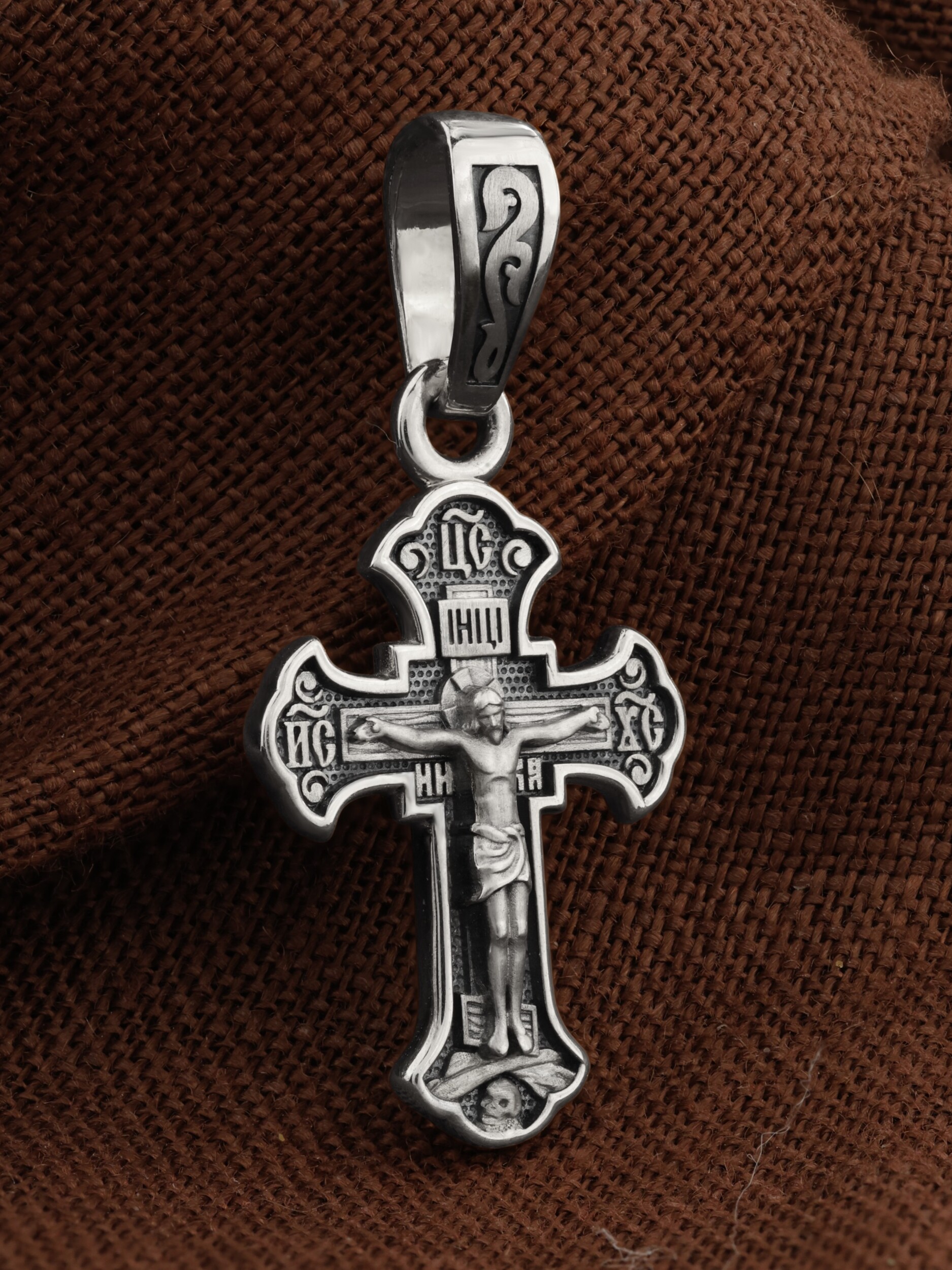 На лицевой стороне креста изображено Распятие Господа и Спасителя нашего Иисуса Христа, отдавшего Себя на смерть для искупления грехов мира. Крест является символом жертвенной любви Всеблагого Бога к падшим людям, всепобеждающим духовным оружием христиан, основанием и средоточием церковной жизни. Над вершиной Распятия помещена надпись «Царь Славы». На верхней перекладине расположена надпись «IНЦI». Она символизирует титло — табличку, на которой, согласно Евангелию, было начертано: Иисус Назорей, Царь Иудейский. Надпись «IC» «ХC»», означает Иисус Христос, помещаются на разных сторонах поперечной перекладины креста. Ниже помещена надпись «НИКА», что означает «победитель». Крест стоит на горе камней, символизирующих Голгофу. Под подножием Креста изображена покоящаяся голова (череп) Адама.