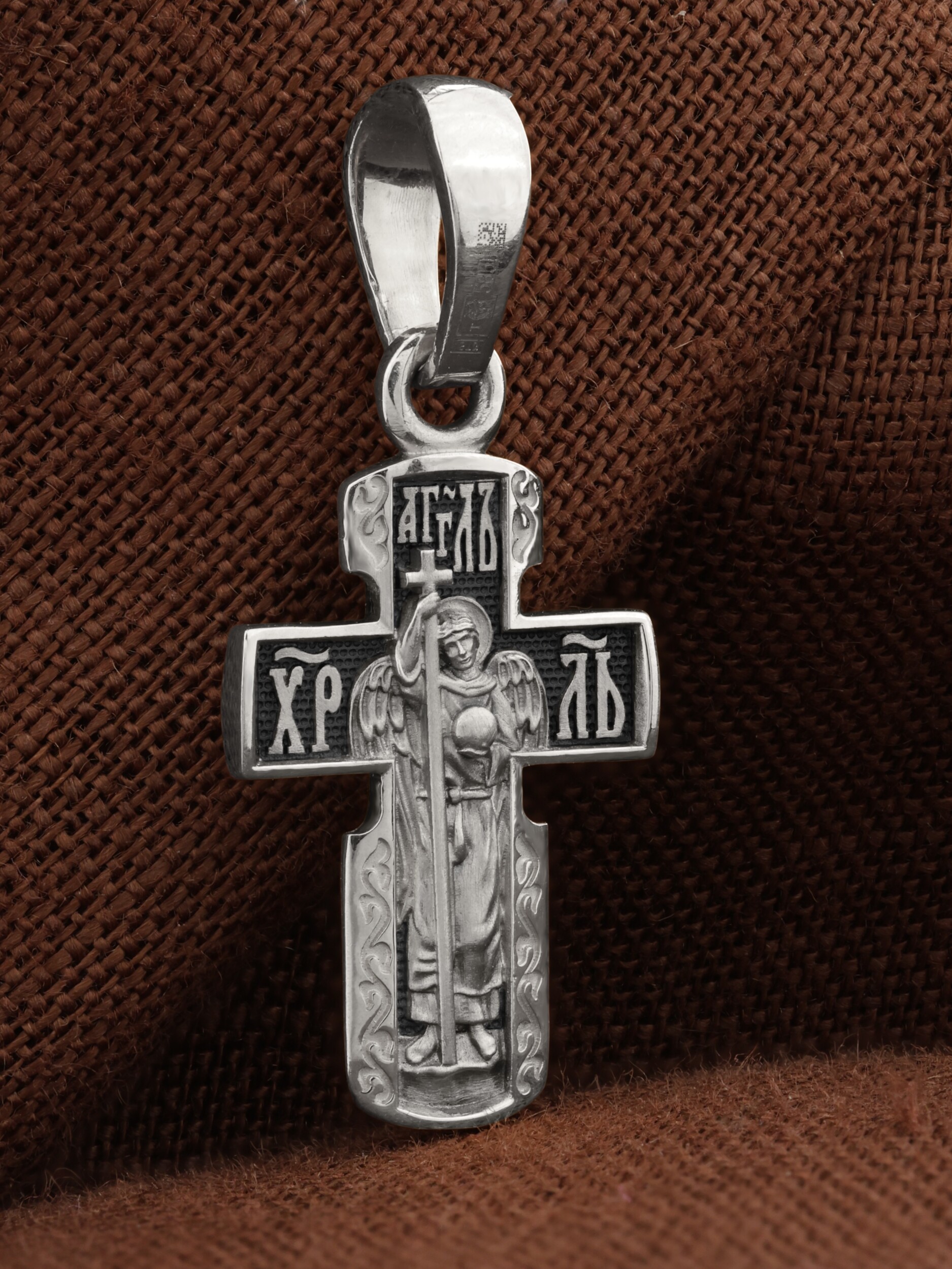 На оборотной стороне креста изображен святой Ангел-Хранитель в виде прекрасного юноши держащего в правой руке крест, а в левой — сферу. Ангел-Хранитель — это Ангел приставляемый Богом к человеку при крещении для охраны и помощи в добрых делах. Невидимо пребывая при нас постоянно, он, руководствуя нас ко спасению, не только по нашему желанию таинственно наставляет нас на все доброе и полезное, не только возносит наши молитвы к Богу, но еще и сам от себя охраняют и защищают нас от врагов видимых и невидимых, ходатайствует за нас пред Богом.
