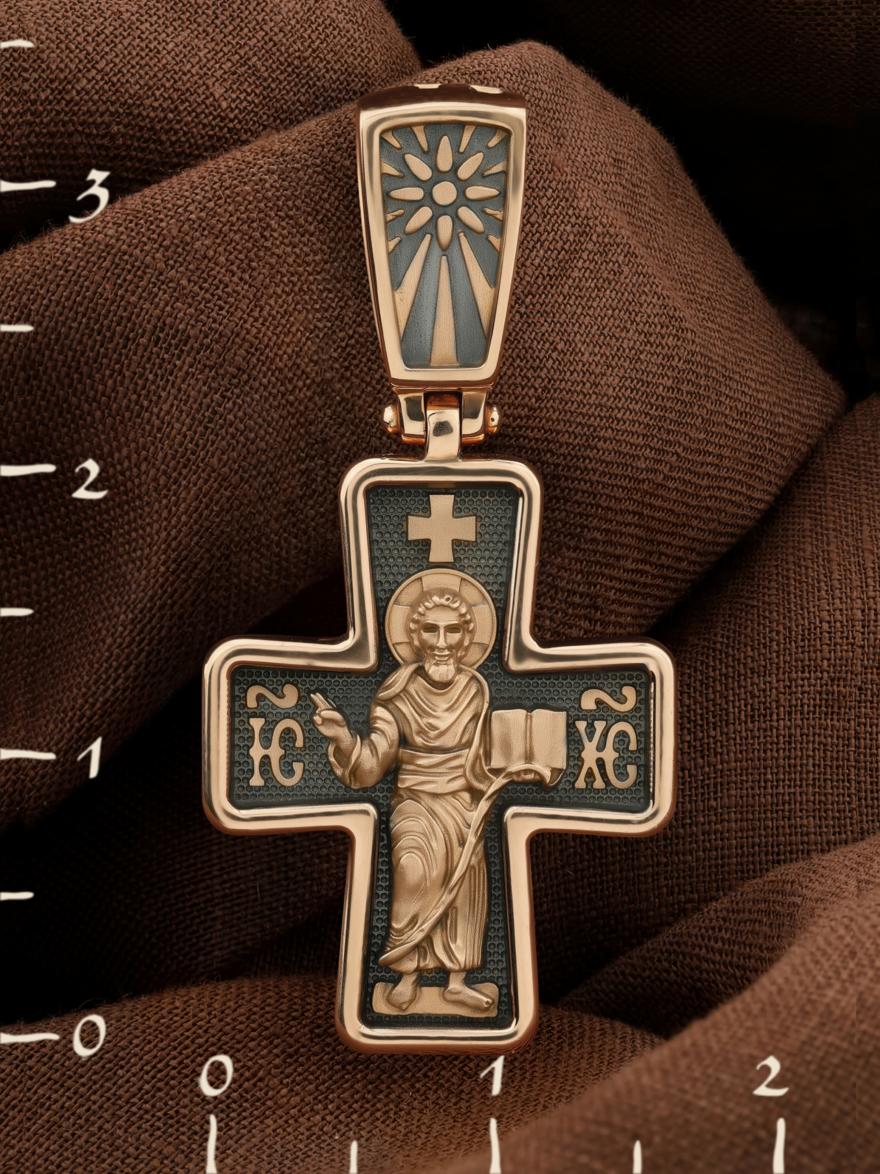 На лицевой стороне креста изображена икона Господа и Спасителя нашего Иисуса Христа — Господь Вседержитель или Пантократор. Он представлен как Царь Небесный и будущий Судия мира. Именование Иисуса «Вседержителем» указывает, с одной стороны, на Его Божественную природу: «Аз есмь Альфа и Омега, начало и конец, говорит Господь, Который есть и был и грядет, Вседержитель» (Откр. 1: 8). С другой стороны, такое именование связано и с человеческой природой Христа, искупившего крестной жертвой людские грехи и обновившего тем самым человеческую природу. Правой рукой Он благословляет, а левой держит Книгу. Она символизирует Евангелие — благую весть, принесенную Христом всему миру. Указывая на раскрытое Евангелие и одновременно благословляя, Иисус недвусмысленно указывает нам путь к спасению души.