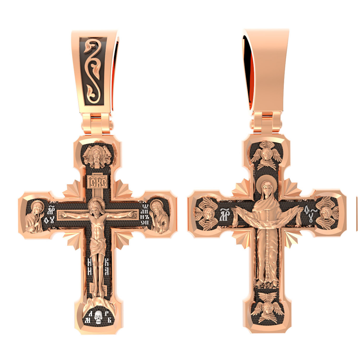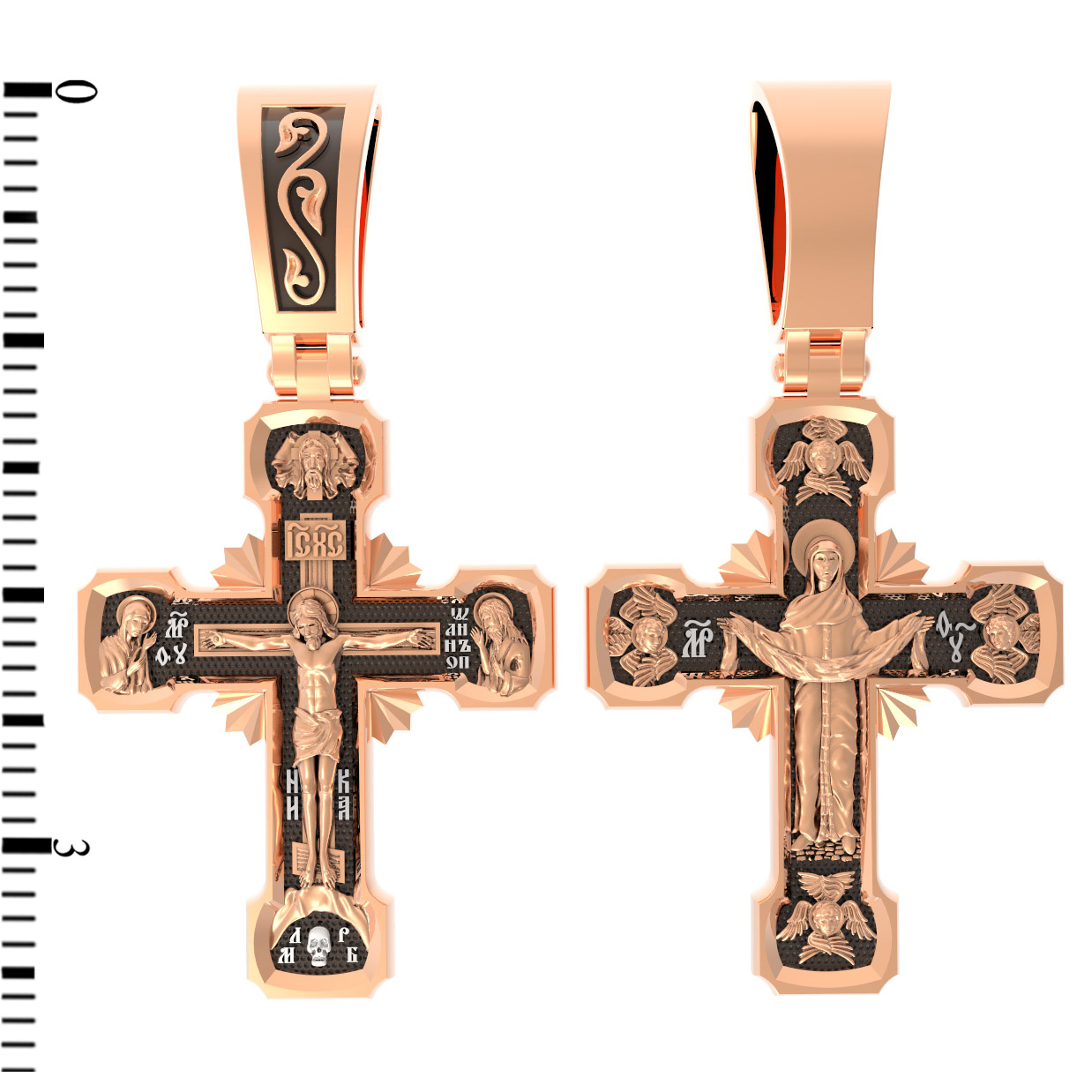 На лицевой стороне креста изображено Распятие Господа Иисуса Христа. Верхняя перекладина символизирует собой табличку с надписью «IHЦI» — Иисус Назарянин Царь Иудейский. Ниже перекладины добавляется: «НИКА» (греч. — Победитель). Возвышение, на котором стоит Крест, символизирует гору Голгофу, на которой произошло Распятие. У подножия Креста изображают прах Адама, обозначенный черепом.