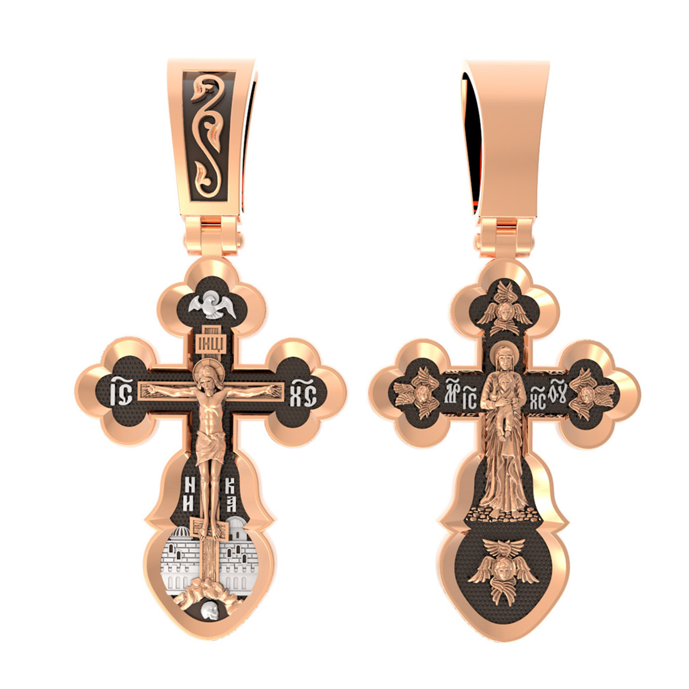 Распятие сопровождается иконографическими надписями, прославляющими Господа Иисуса Христа. На боковых оконечностях размещены инициалы святого имени Спасителя «IС ХС» и надпись «Сын Божий», обозначающая Его божественную природу. На подножии Креста можно прочитать надпись «НИКА» (Победитель) — символ победы Господа над смертью. Венчает лицевую сторону образ Святого Духа в виде голубя.