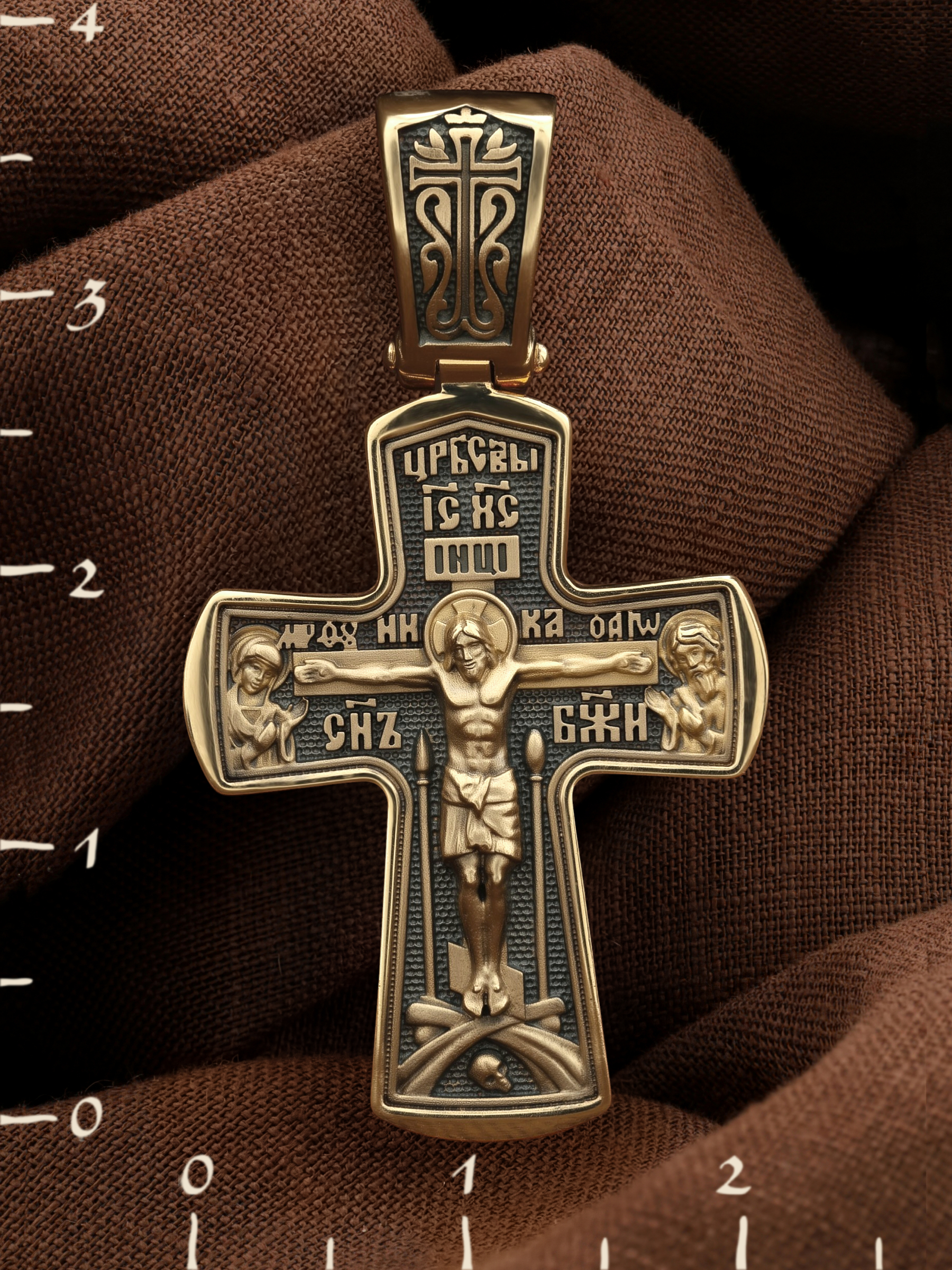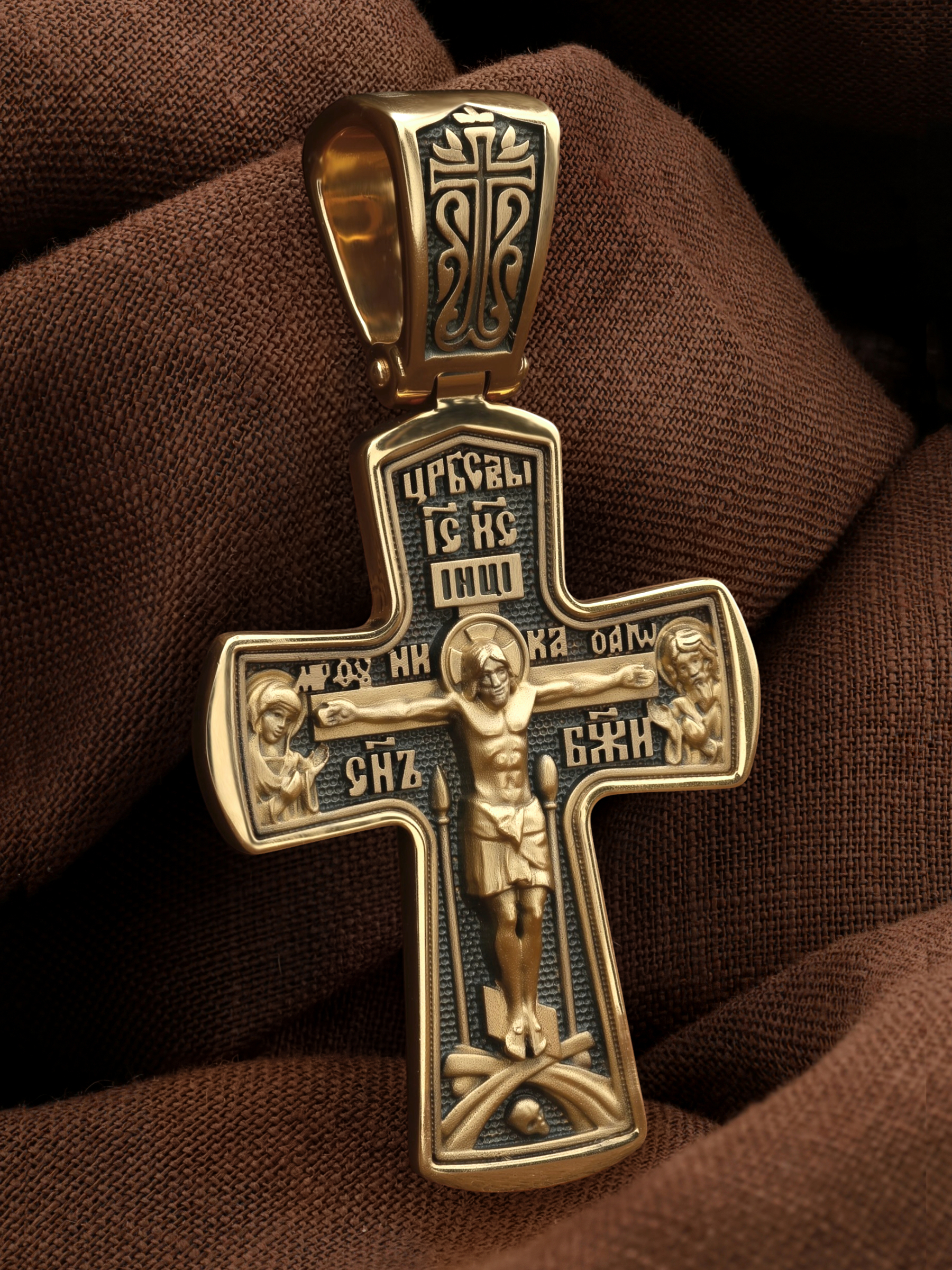 На лицевой стороне креста изображено Распятие Господа и Спасителя нашего Иисуса Христа, отдавшего Себя на смерть, для искупления грехов мира. Крест является символом жертвенной любви Всеблагого Бога к падшим людям, всепобеждающим духовным оружием христиан, основанием и средоточием церковной жизни. Господь сказал: «кто хочет идти за Мною, отвергнись себя, и возьми крест свой, и следуй за Мною». (Мк. 8: 34). На кулонном кольце изображен процветший крест. На верхней табличке, выше головы Иисуса, расположена надпись, составленная Понтием Пилатом — «IНЦI». Она означает «Иисус Назорей, Царь Иудейский». Распятие сопровождается каноническими надписями. Выше Распятия помещена надпись «Царь Славы» и надпись «IC» «ХC», означает Иисус Христос. Слово «НИКА», что означает «победитель» и надпись «Сын Божий», что означает божественную природу Иисуса Христа, помещаются на разных сторонах поперечной перекладины креста. Слева от Распятия изображена Пресвятая Богородица, справа — Про¬рок Предтеча и Креститель Господень Иоанн. Вдоль креста помещены Орудия Страстей Господних — копие сотника Лонгина и трость с губкой. Крест стоит на горе камней, символизирующих Голгофу. В ее основании различается череп– это голова Адама. На православном кресте Христос не умирает, а свободно простирает руки, ладони Иисуса открыты, будто он хочет обнять все человечество, даря им свою любовь и открывая путь к вечной жизни.