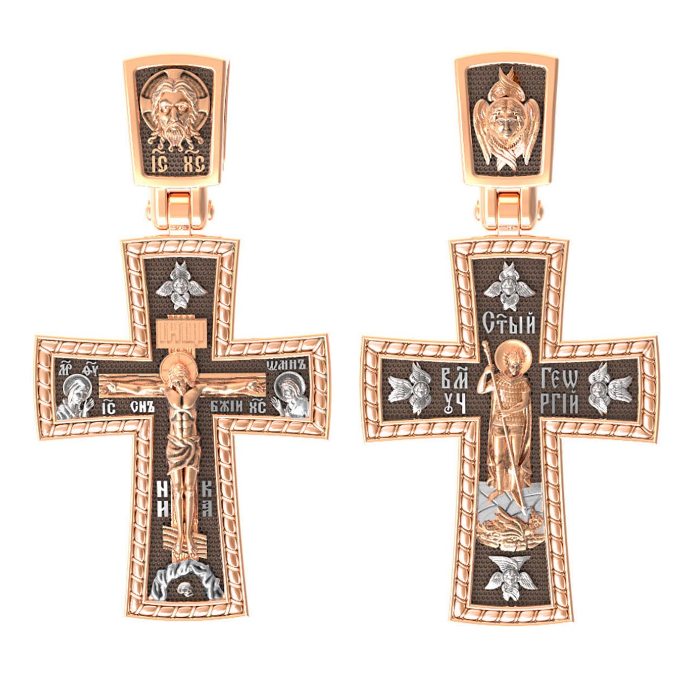 В центре оборотной стороне креста помещен образ Святого Великомученика Георгия Победоносца — одного из самых почитаемых и удивительных святых. На Руси он известен как Юрий или Егорий, покровитель воинов, помощник в крестьянском труде. На образке он изображен как воитель поражающий копьем огнедышащего змея. Змей символизирует собою сатанинские силы. Молитвами вознесенными к Всевышнему и своей непреклонной верой он смог одолеть чудовище. Святой убил змея, спас царскую дочь, принесенную в жертву, и жителей города, их души от влияния дьявола, породив в них надежду и веру в Господа, призывая людей принять христианскую веру. Вокруг образа изображены четыре Серафима.