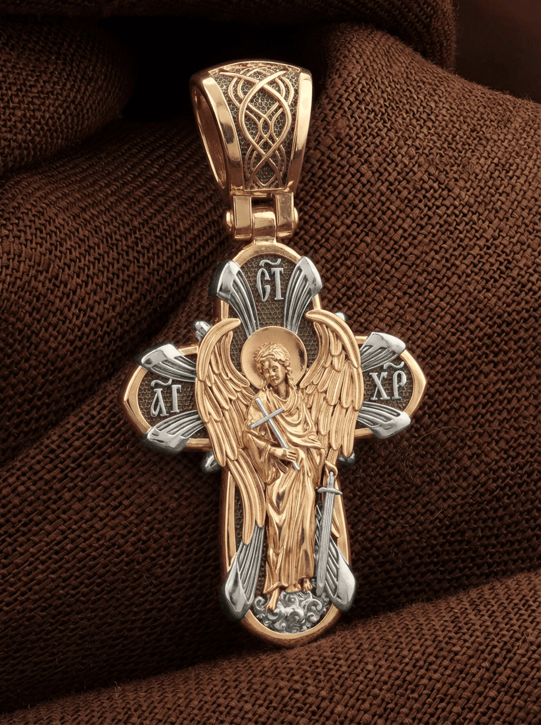 На оборотной стороне креста изображен Святой Ангел-Хранитель держащий в правой руке крест, а в левой — мечь.. Ангел-Хранитель — это Ангел приставляемый Богом к человеку при крещении для охраны и помощи в добрых делах. Он невидимо находится при человеке на протяжении всей его жизни, если человек сохраняет в себе любовь к Богу и истинную веру перед Ним. Ангел-Xранитель делают для нас все, что служит к истинному нашему благу и спасению. Невидимо пребывая при нас постоянно, он, руководствуя нас ко спасению, не только по нашему желанию таинственно наставляет нас на все доброе и полезное, не только возносит наши молитвы к Богу, но еще и сам от себя охраняют и защищают нас от врагов видимых и невидимых и ходатайствует за нас пред Богом. Ангел-Хранитель так любит нас, как никто на земле любить не может. Ангел-Хранитель — присный друг наш, незримый тихий собеседник, пресладостный утешитель. Одного лишь каждому из нас он желает — спасения души; к этому он направляет все свои заботы. И если видит нас также заботящимися о спасении, радуется, если же видит нас пребывающими в нерадении о душе своей, скорбит. Но и самый великий грешник может примириться со своим Ангелом-Хранителем посредством искреннего раскаяния в грехах и оставления их навсегда. В таком случае, по слову Писания, великая радость бывает для всех ангелов на небесах (Лк. 15:10).