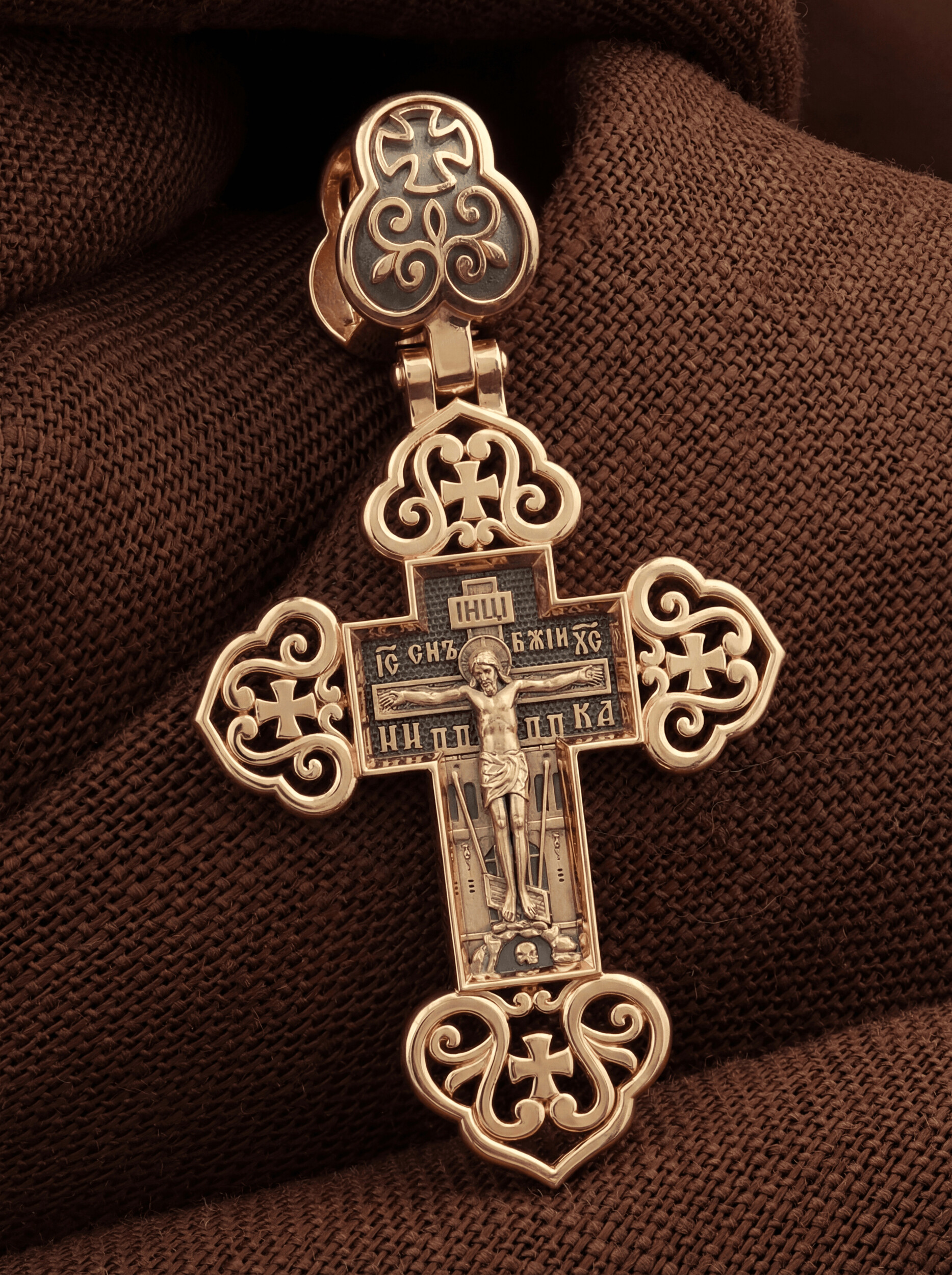 На лицевой стороне изображено Распятие. Над титлом видим слова «ЦРЬ СЛВЫ» — Царь Славы. Верхняя перекладина символизирует собой табличку с надписью «IHЦI» — Иисус Назарянин Царь Иудейский. Над перекладиной пишется сокращенно имя Спасителя «IC XC» — Иисус Христос и словосочетание «СНЪ БЖIЙ» — СЫН БОЖИЙ. Ниже перекладины добавляется «НИКА» (греч. — Победитель). Возвышение, на котором стоит Крест, символизирует гору Голгофу, на которой произошло Распятие. У подножия Креста изображают прах Адама, обозначенный черепом. Рядом с Крестом из горы выступают орудия страданий Господа — трость и копие, обозначенные буквами Т и К.