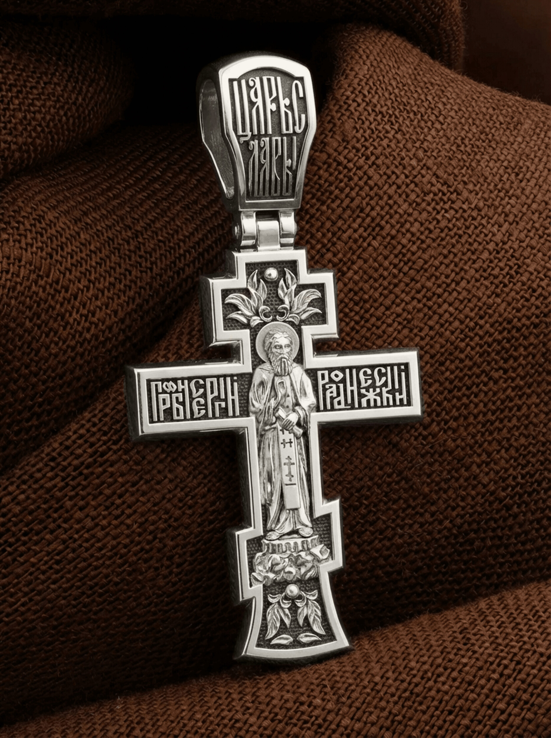 На лицевой стороне этого креста центральную часть занимает икона Распятия Христа — образ жертвы, принесенной Господом за грехи людей. Именно ко Христу, сошедшему на землю ради нашего спасения, возносятся все молитвы. Рядом с Его образом помещены слова — «НИКА» и «Сын Божий». Эти слова характеризуют Господа как Великого Архиерея, победителя смерти. Также Распятие сопровождается надписями, олицетворяющими Христа — это святое имя Христа «IC» (Иисус) «ХС» (Христос). На кулонном кольце написано «Царь Славы».