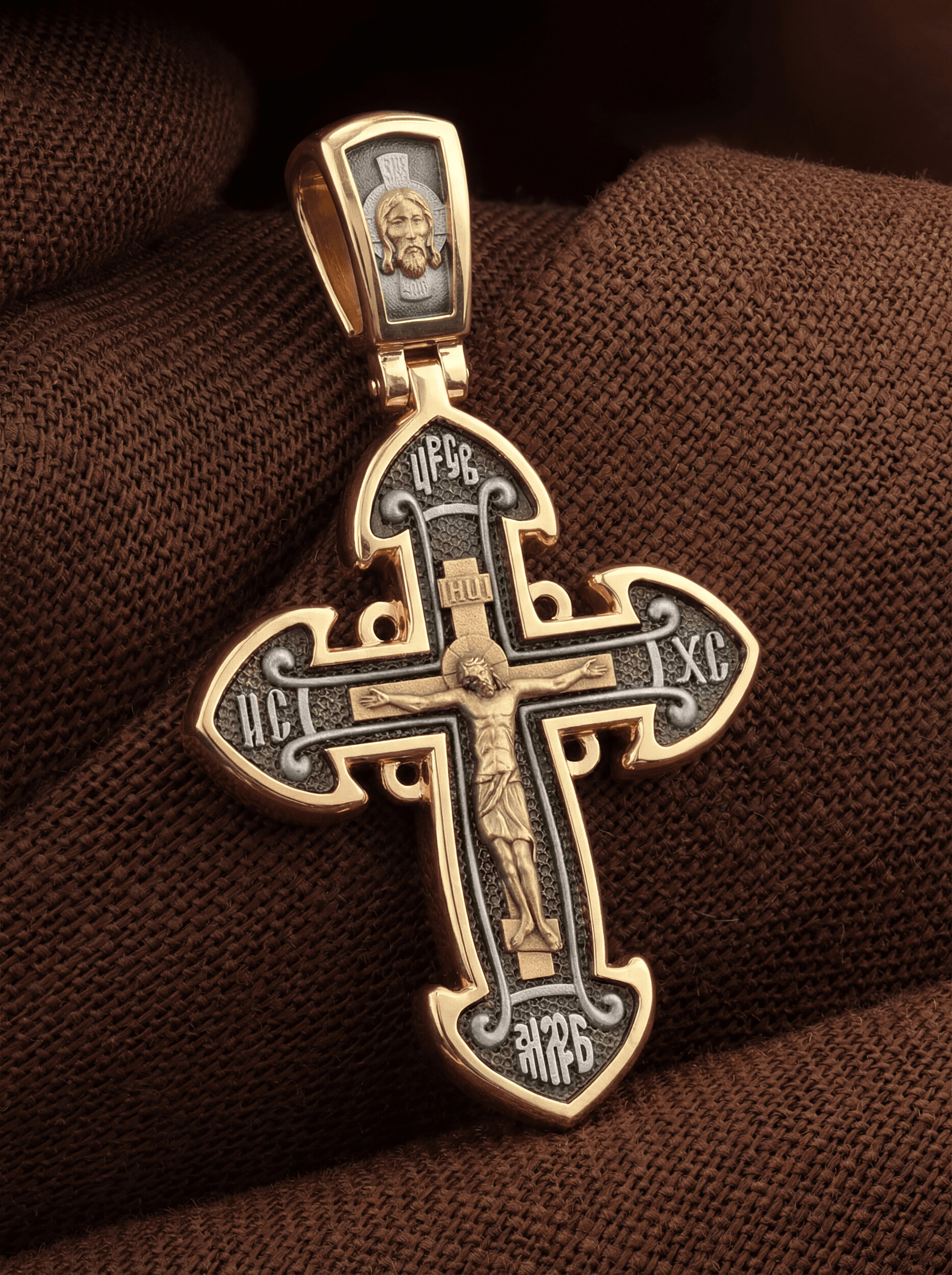 Традиционно на лицевой стороне этого креста изображено Распятие. Это связано с тем, что любой нательный крест в первую очередь символизирует крестные страдания Христа, Его смерть и Воскресение. Поэтому древний вид Распятия являет вознесенного на Крест Сына Божия не просто прибитого к кресту, а словно простирающего руки и призывающего в Свои объятия весь мир. Сохраняя образ страдания Христа, такой вид Распятия в то же время удивительно точно передает его духовный смысл. Христос, распятый и умерший, изображен живым в самой Своей смерти. С двух сторон раскинутых рук Христа написаны инициалы Его имени — «ИС ХС». Сверху над Распятием размещена надпись «Царь Славы», а у подножия Господа видна аббревиатура «МЛ РБ» (Место Лобное Рай Бысть), символизирующая гору Голгофу.