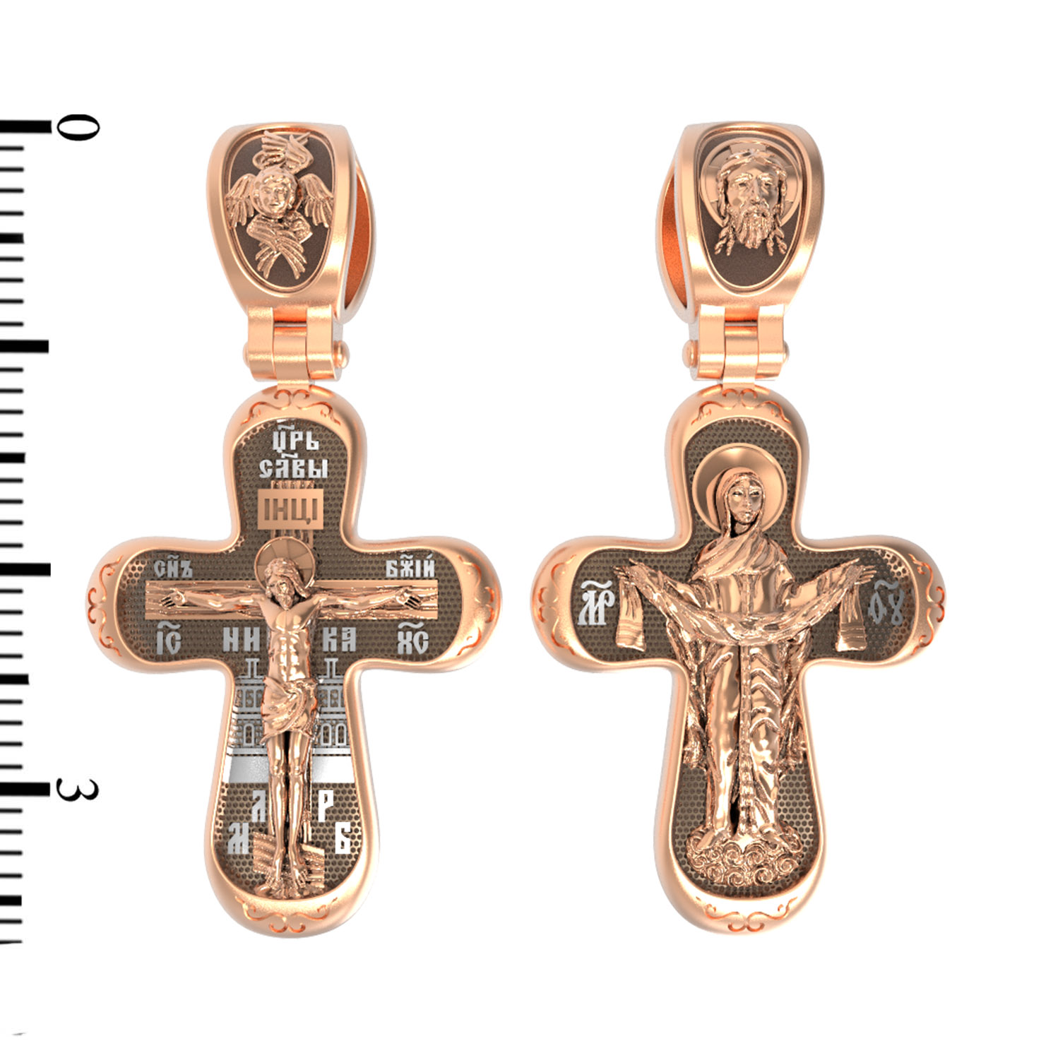 На обороте креста изображена икона Покрова Пресвятой Богородицы. Праздник Покрова Божией Матери является воспоминанием чуда, которое произошло во Влахнернской церкви 1 (14) октября 910 года: Пресвятая Богородица явилась верующим над алтарем храма и распростерла над ними Свое покрывало. В этот день Божья Матерь открыла людям, что Она является Ходатаицей за них перед Богом. Богородица простирает Свой молитвенный покров над всеми православными христианами и умоляет Сына Своего о даровании вечного спасения каждому человеку. На кулонном кольце изображен Спас Нерукотворный — Символ вочеловечившегося Божества и шестикрылый Серафим — самый приближенный к Господу Ангел.