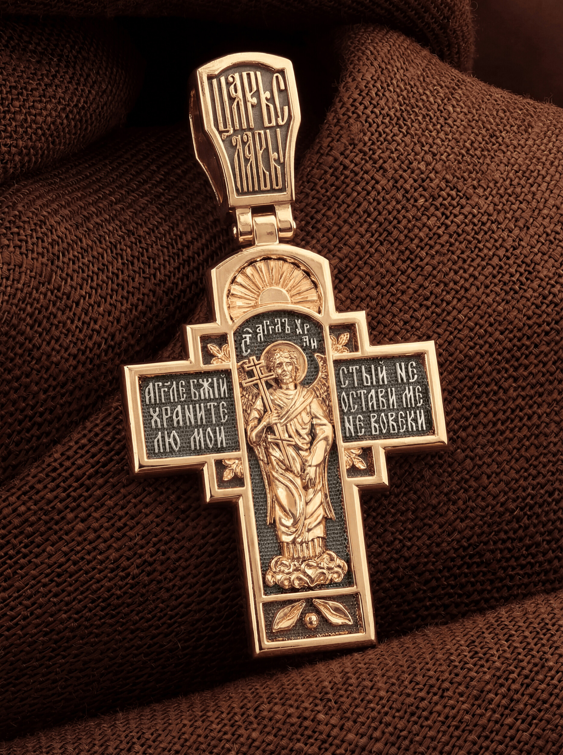 Оборотную сторону креста возглавляет Ангел Хранитель с крестом: им он защищает человека от злых духовных и физических нападений. Ангел не может нарушить свободу воли человека, поэтому его надо молитвенно просить о помощи: «Ангеле Божий, хранителю мой святый, не остави мене вовеки», — эта молитва написана вокруг его образа.