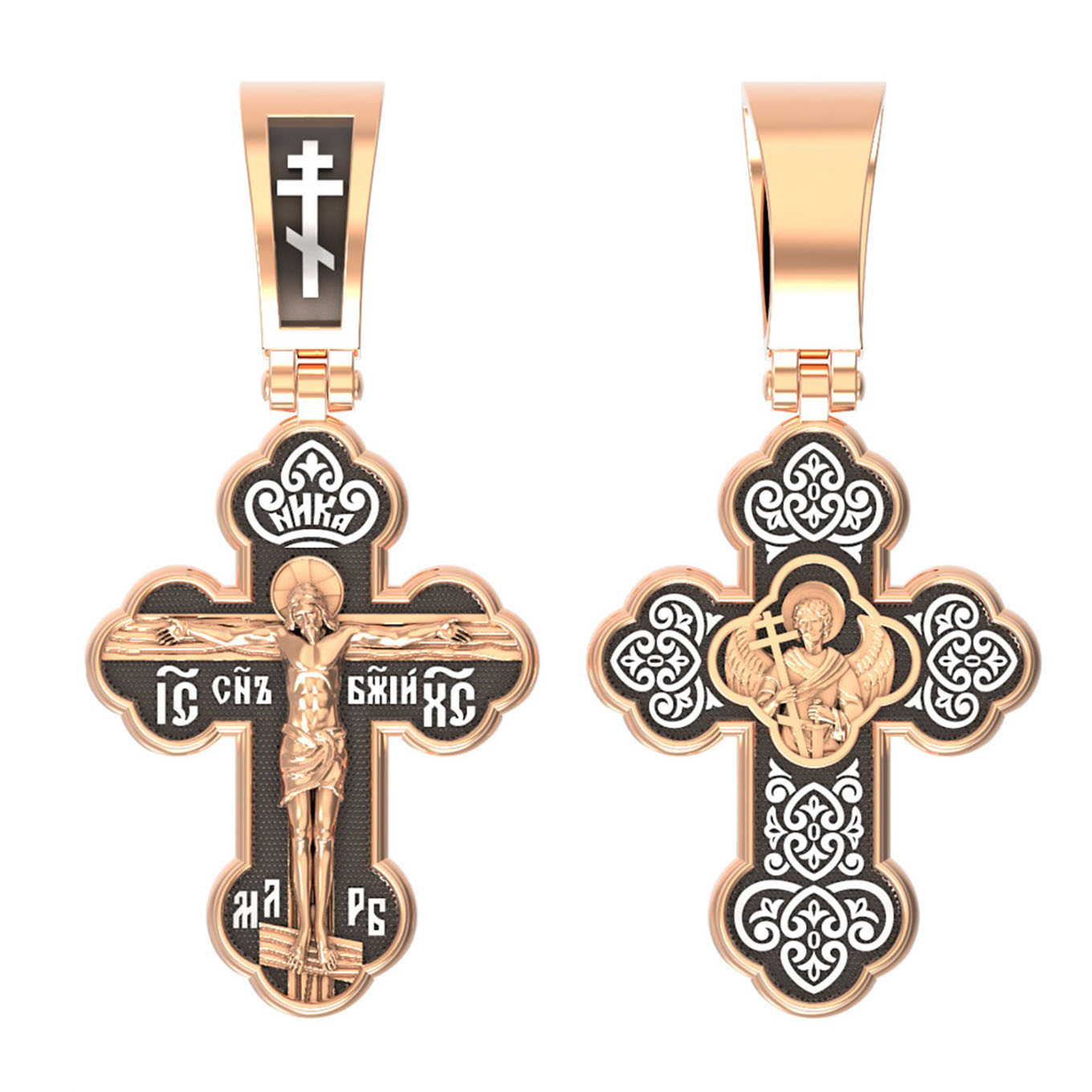 Крест нательный четырехконечный с трехлепестковыми завершениями перекладин. Основой композиции лицевой стороны креста является Распятие Иисуса Христа. С обеих сторон горизонтальной перекладины надписи — монограмма святого имени Христа — «ИС ХС», а под ней «Сын Божий». Над головой Христа надпись — «НИКА» (Победитель). В подножии мы видим изображенную гору Голгофу в виде скалистой горки, а так же буквы «МЛ» «РБ», которые означают: «Место Лобное Рай Бысть». Крест, на котором Спаситель мира принес Искупительную жертву, открыл врата рая, затворившиеся после грехопадения Адама. Поэтому Лобное место (Голгофа) стало раем.