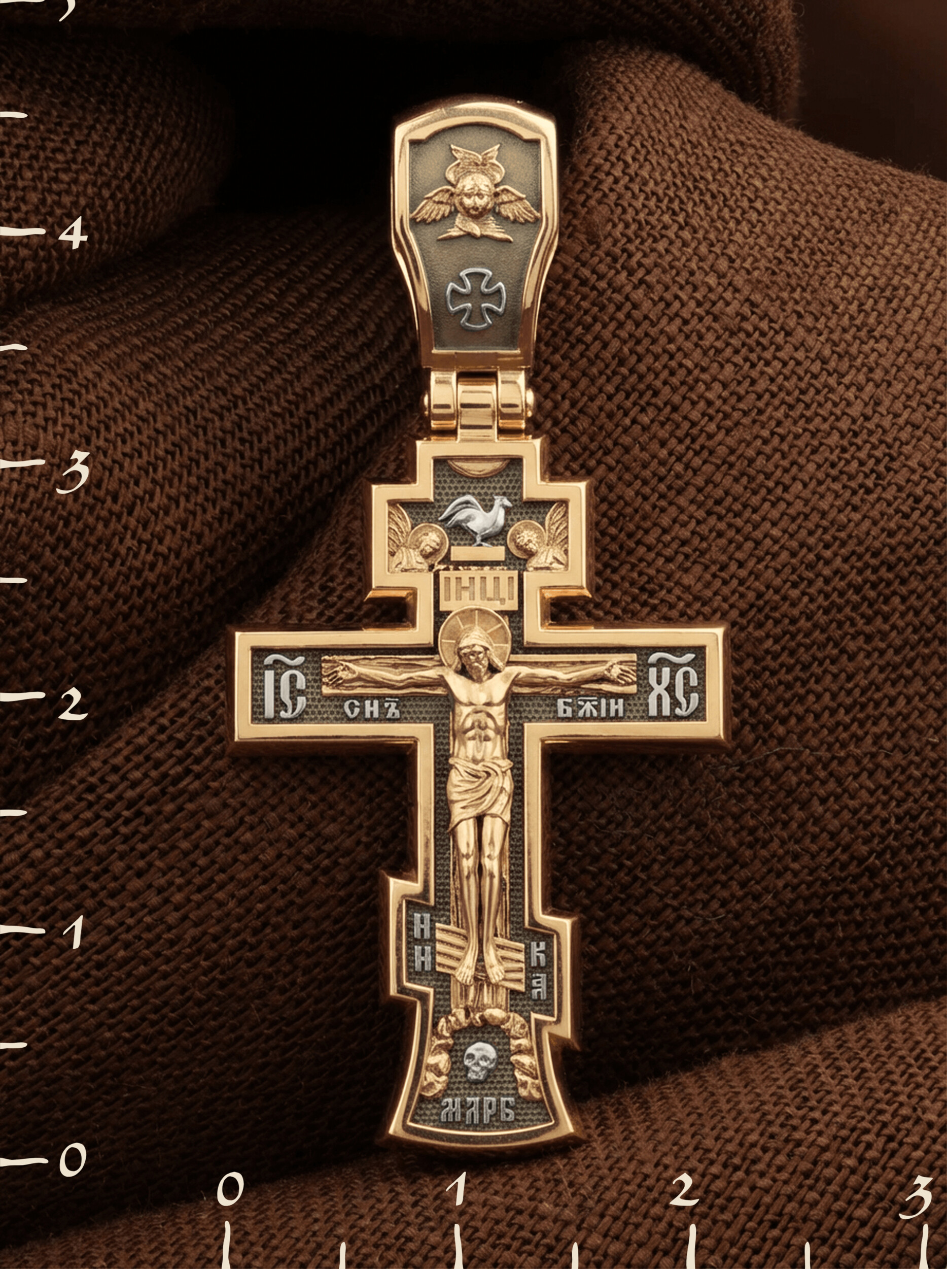 На лицевой стороне этого креста центральную часть занимает икона Распятия Христа — образ жертвы, принесенной Господом за грехи людей. Именно ко Христу, сошедшему на землю ради нашего спасения, возносятся все молитвы. Рядом с Его образом помещены слова — «НИКА» и «Сын Божий». Эти слова характеризуют Господа как Великого Архиерея, победителя смерти. Также Распятие сопровождается надписями, олицетворяющими Христа — это святое имя Христа «IC» (Иисус) «ХС» (Христос). На кулонном кольце написано «Царь Славы».