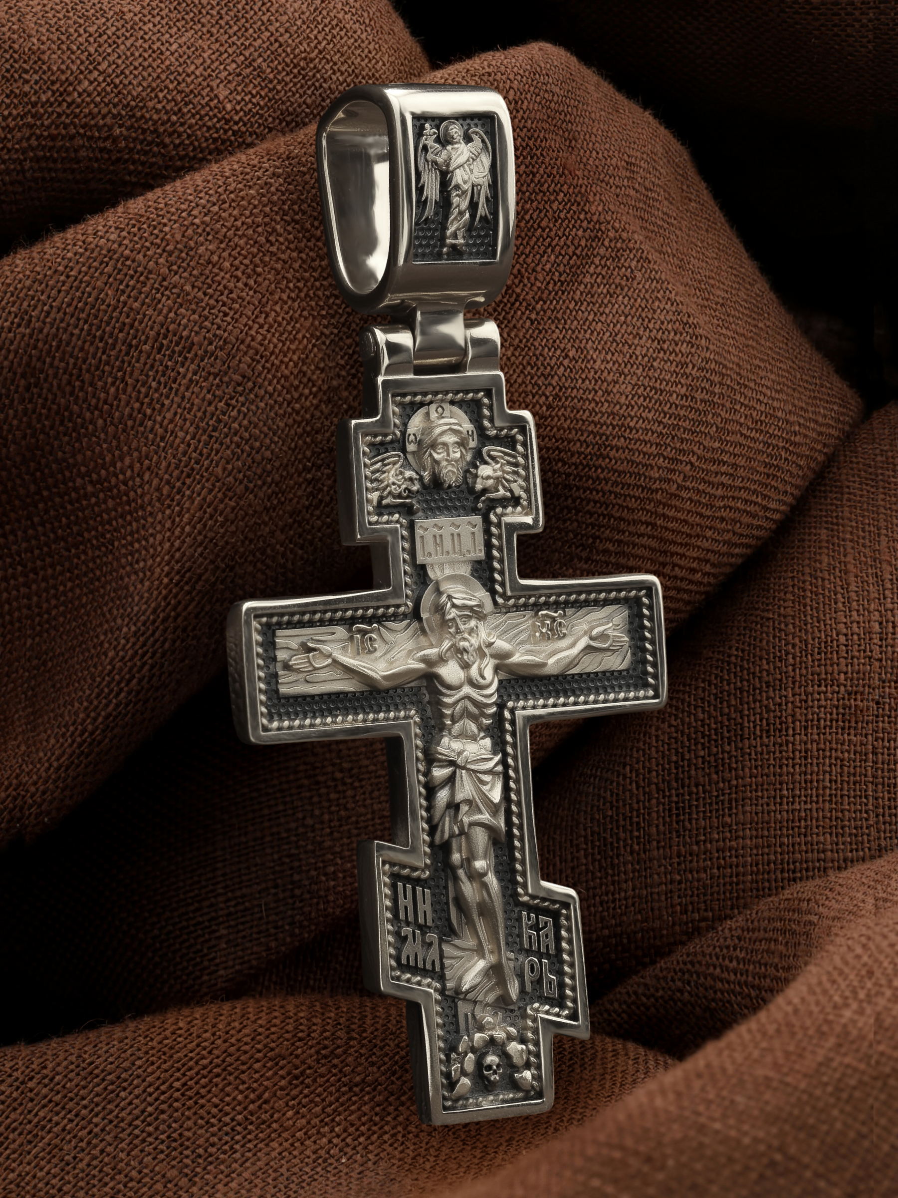 На лицевой стороне креста изображено Распятие, потому что это орудие казни Иисус Христос сделал орудием победы над грехом и смертью. Своими страданиями Он искупил грехи человечества, умерев и сошествовав во ад, победил сатану, освободил души праведников от вечной смерти и открыл им небесные врата рая. Жертва Христа сделала возможным спасение для каждого человека. На православном кресте Христос не умирает, а свободно простирает руки, ладони Иисуса открыты, будто он хочет обнять все человечество, даря им свою любовь и открывая путь к вечной жизни. Верхняя перекладина символизирует собой табличку с надписью «IHЦI» — Иисус Назарянин Царь Иудейский. У подножия добавляется: «НИКА» (греч. — Победитель) и «МЛРБ» — Место Лобное Рай Бысть. Возвышение, на котором стоит Крест, символизирует гору Голгофу, на которой произошло Распятие. У подножия Креста изображают прах Адама, обозначенный черепом.