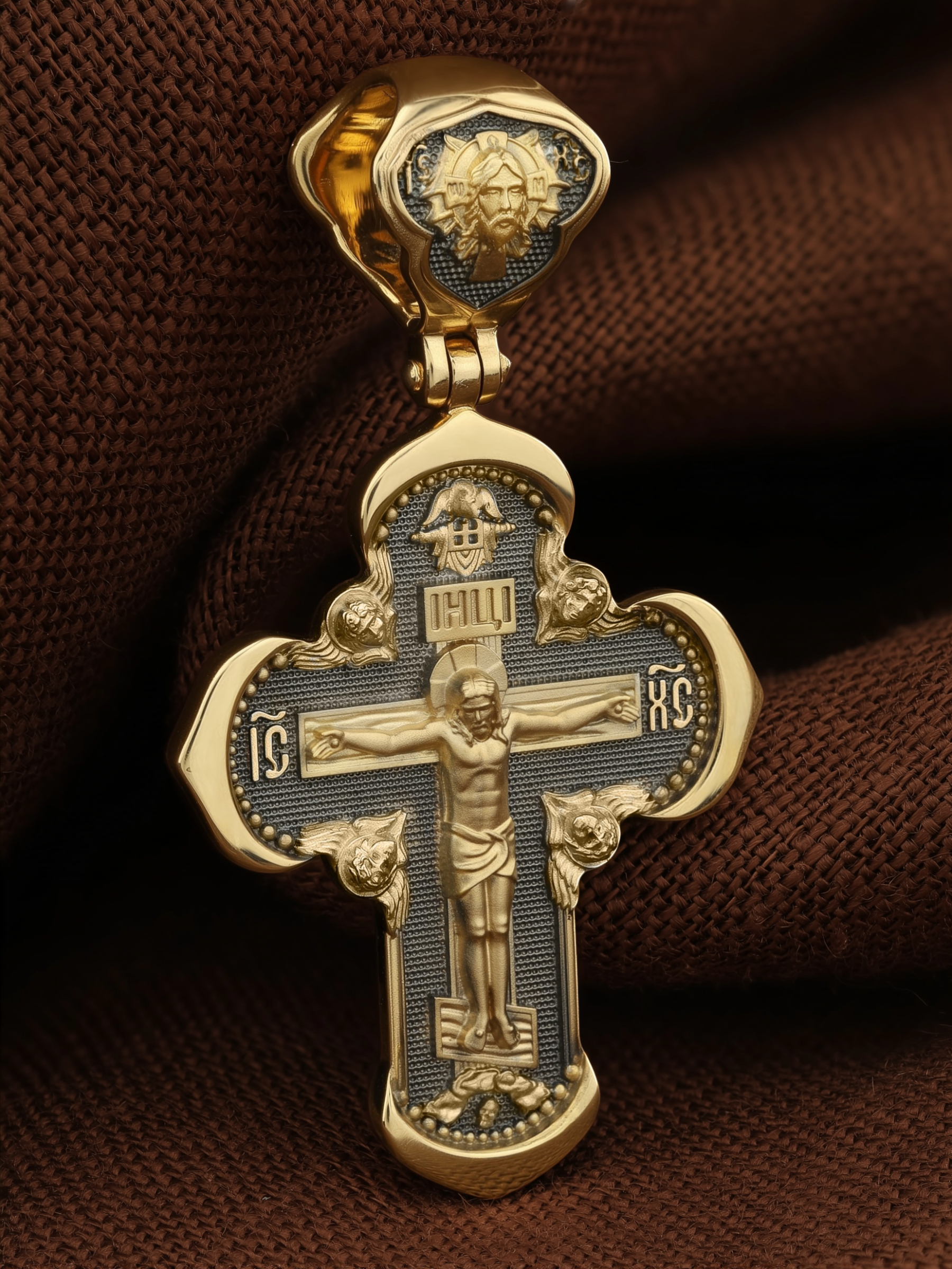 На лицевой стороне креста изображено Распятие Господа и Спасителя нашего Иисуса Христа, отдавшего Себя на смерть, для искупления грехов мира. Крест является символом жертвенной любви Всеблагого Бога к падшим людям, всепобеждающим духовным оружием христиан, основанием и средоточием церковной жизни. Господь сказал: «кто хочет идти за Мною, отвергнись себя, и возьми крест свой, и следуй за Мною». (Мк. 8: 34). На верхней табличке, выше головы Иисуса, расположена надпись, составленная Понтием Пилатом — «IНЦI». Она означает «Иисус Назорей, Царь Иудейский». Надпись «IC» «ХC», означает Иисус Христос, помещается на разных сторонах поперечной перекладины креста. Крест стоит на горе камней, символизирующих Голгофу. В ее основании различается череп– это голова Адама. На кулонном кольце изображен Нерукотворный образ Господа и Спасителя нашего Иисуса Христа, чудесно отпечатавшийся на плате, которым Христос вытер свой лик.