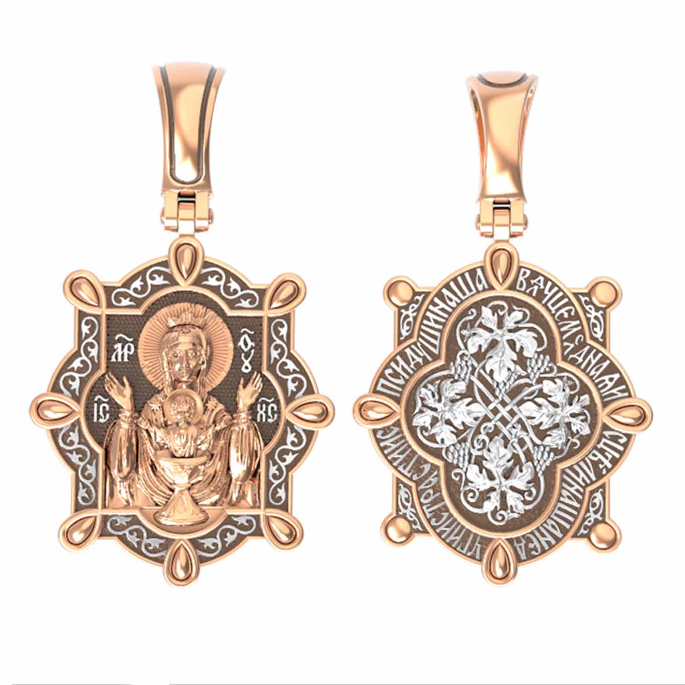На лицевой части образка изображена икона Божией Матери «Неупиваемая чаша». Икона славится помощью в исцелении зависимостей, помогает людям обрести свободу от греховных страстей.