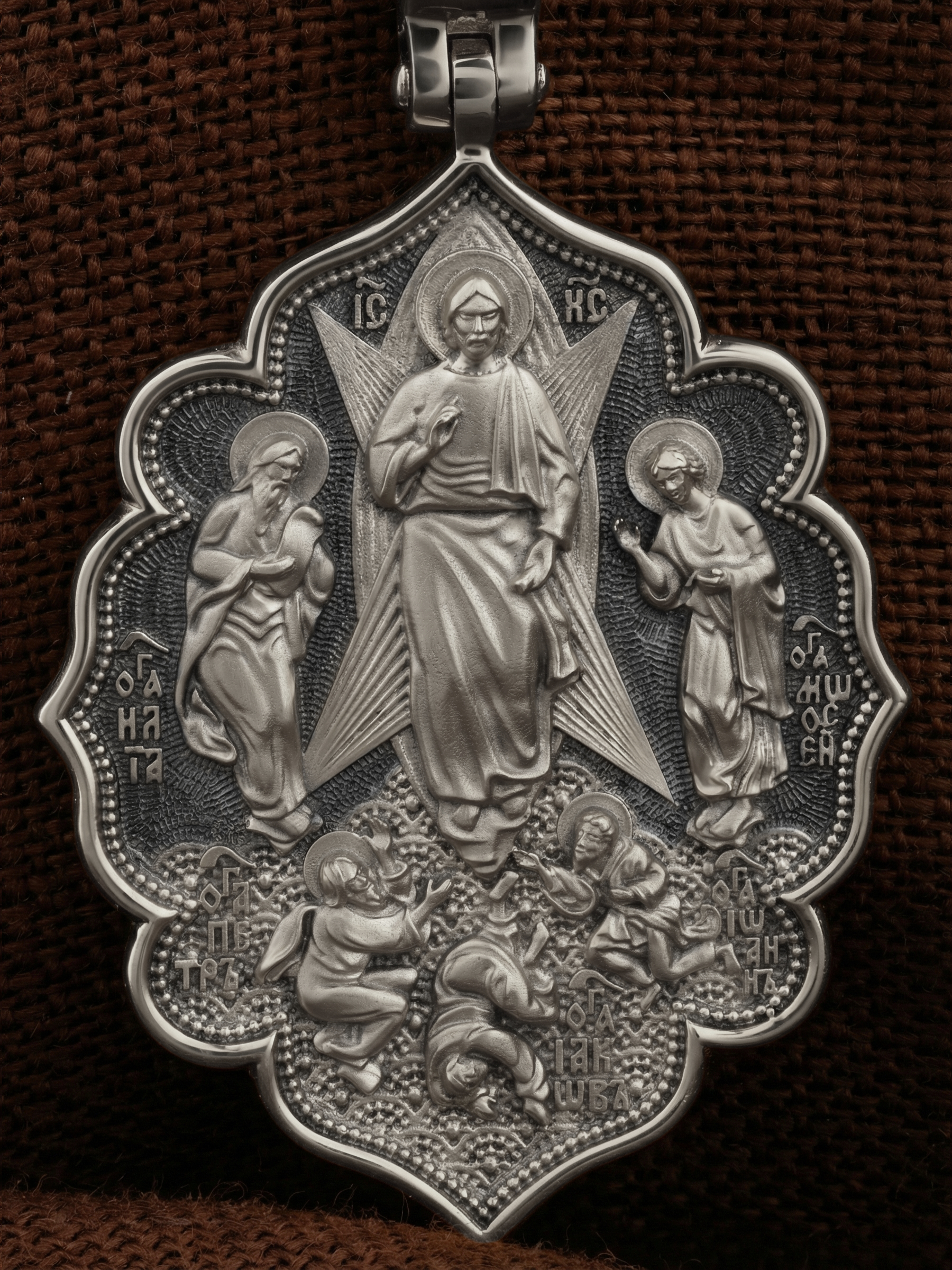 На лицевой стороне образка изображена икона «Преображение». Образ являет Господа Иисуса Христа в тот момент, когда Он предстал трем Своим ученикам: Петру, Иакову и Иоанну Богослову. Пророки Моисей и Илия предстояли рядом и беседовали с Ним. Апостолы едва могли вынести бесконечную радость, которая охватила их в присутствии Бога. Когда же на гору спустилось облако и раздался глас Божий: «Сей есть Сын Мой Возлюбленный; Его слушайте», апостолы в сильном страхе пали на землю (Лк. 9:35). На иконах «Преображение» они так и изображаются — лежащими у ног Христа.