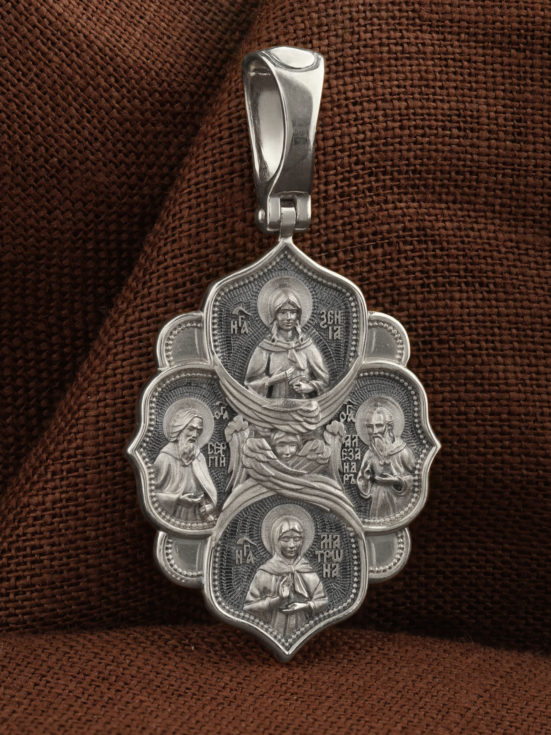 На обороте образка изображены четверо возлюбленных Богом угодников. Слева от Серафима изображен прп. Сергий Радонежский. Этот святой начал свой путь к Богу отшельником в Радонежских лесах, где основал монастырь, ставший духовным центром Руси. Он исцелял больных, которых ему привозили отовсюду, и даже воскресил отрока.