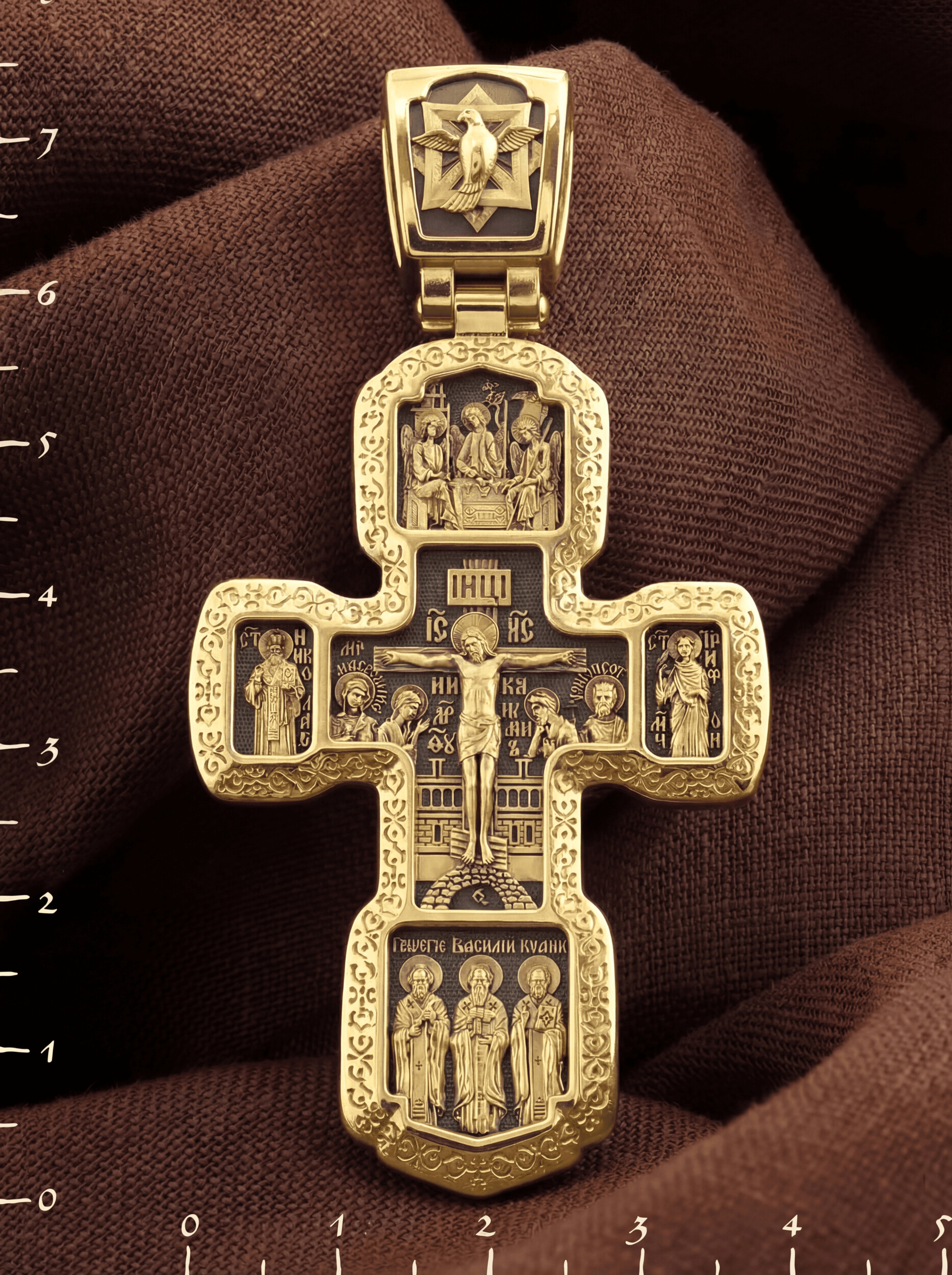 Центральную часть лицевой стороны занимает Распятие Господа Иисуса Христа с предстоящими Ему святыми, которые, по преданию, находились у Креста Господа во время Его казни. Слева — Пресвятая Богородица и жены-мироносицы — равноапостольная Мария Магдалина и святая Мария Клеопова, справа — праведный Иосиф Аримофейский и мученик Лонгин Сотник. Над Распятием помещена икона Святой Троицы. Ангелы сидят за трапезным столом вокруг чаши, которая символизирует грядущую жертву Второго Лица Пресвятой Троицы, Бога Сына. Слева от Господа находится святой Николая Чудотворец, справа — святой мученик.