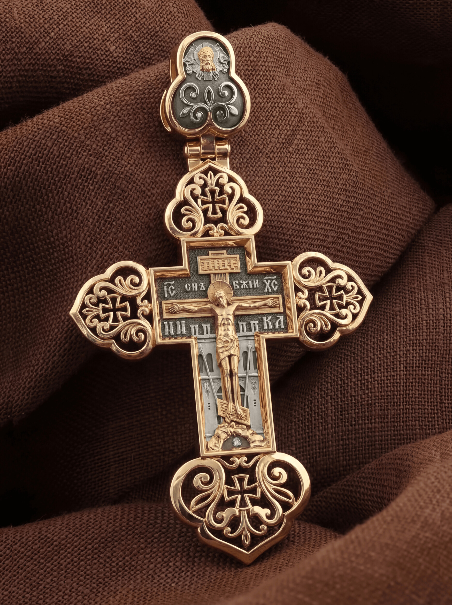 Крест с рельефным изображением Распятия в окружении пышных цветов и ажурного узора, напоминает нам о красоте Райского сада. Такой крест вводит мотив процветшего креста и ассоциируется с образом райского Древа Жизни. Как через древо познания пришла смерть, так через Крест Христа — «Древо Жизни» — даровано спасение.