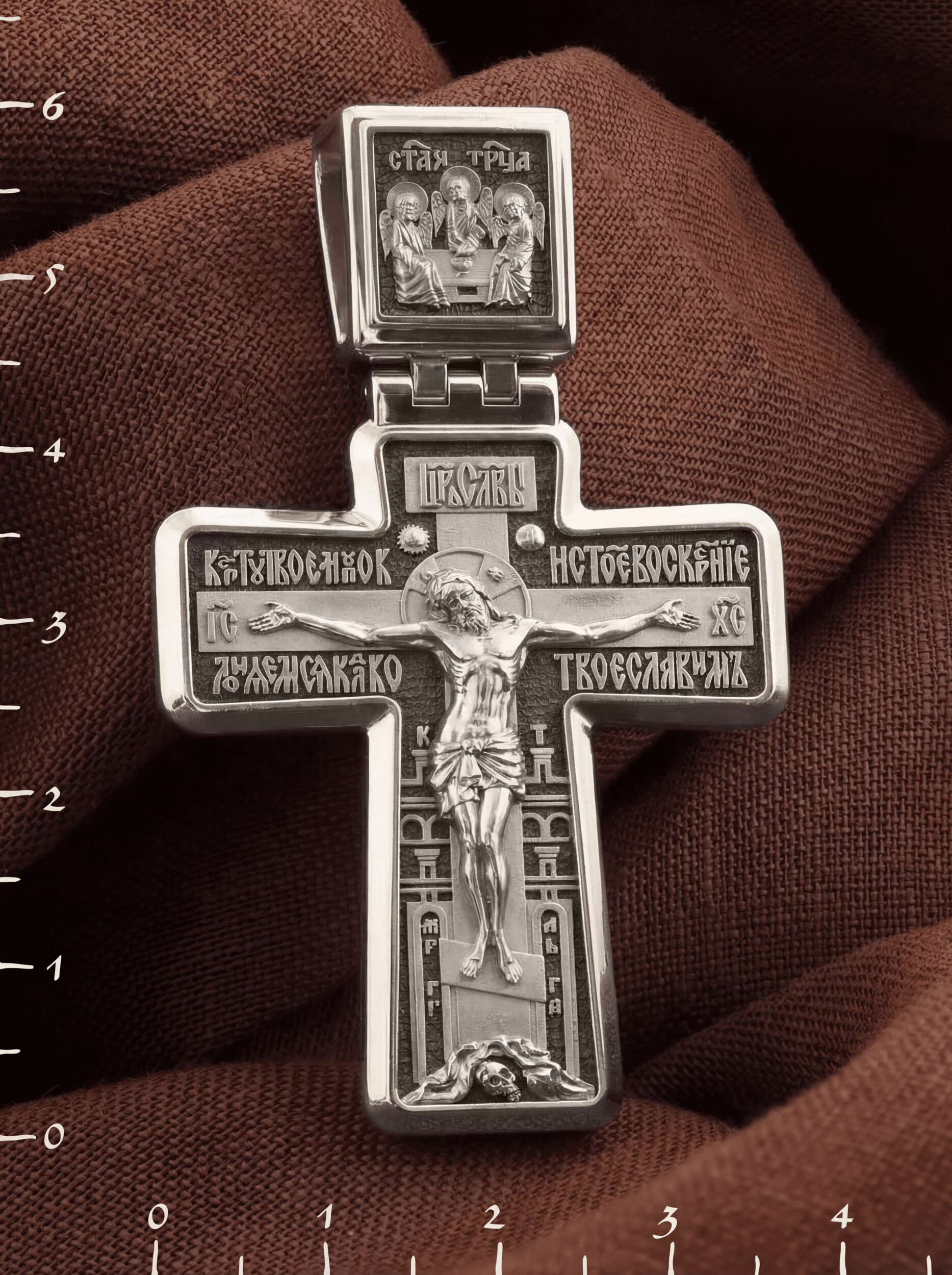 На лицевой стороне креста изображено Распятие Иисуса Христа. Позади Его изображена иерусалимская стена, знак того, что Господь был распят вне стен города. Но вместе с тем стена знаменует и Небесный Иерусалим, путь в который открылся для человечества через Голгофу: «МЛРБ», «Место Лобное Рай Бысть» — написано у ее основания. Рядом с Его образом помещены слова «Царь Славы». Эти слова характеризуют Господа как Великого Архиерея, победителя смерти. Верхняя перекладина символизирует титло — табличку, на которой, согласно Евангелию, было начертано: «Иисус Назорей Царь Иудейский» (IНЦI). Также Распятие сопровождается надписями, олицетворяющими Христа. Это святое имя Христа «IC» (Иисус) «ХС» (Христос), и словосочетание «Сын Божий», а так же написан тропарь Животворящему Кресту: «Кресту Твоему поклоняемся, Владыко, и святое воскресение Твое славим». Распятие стоит на горе камней, символизирующих Голгофу, в основании которой различается череп. Это голова Адама. На кулонном кольце помещено изображение Святой Троицы.