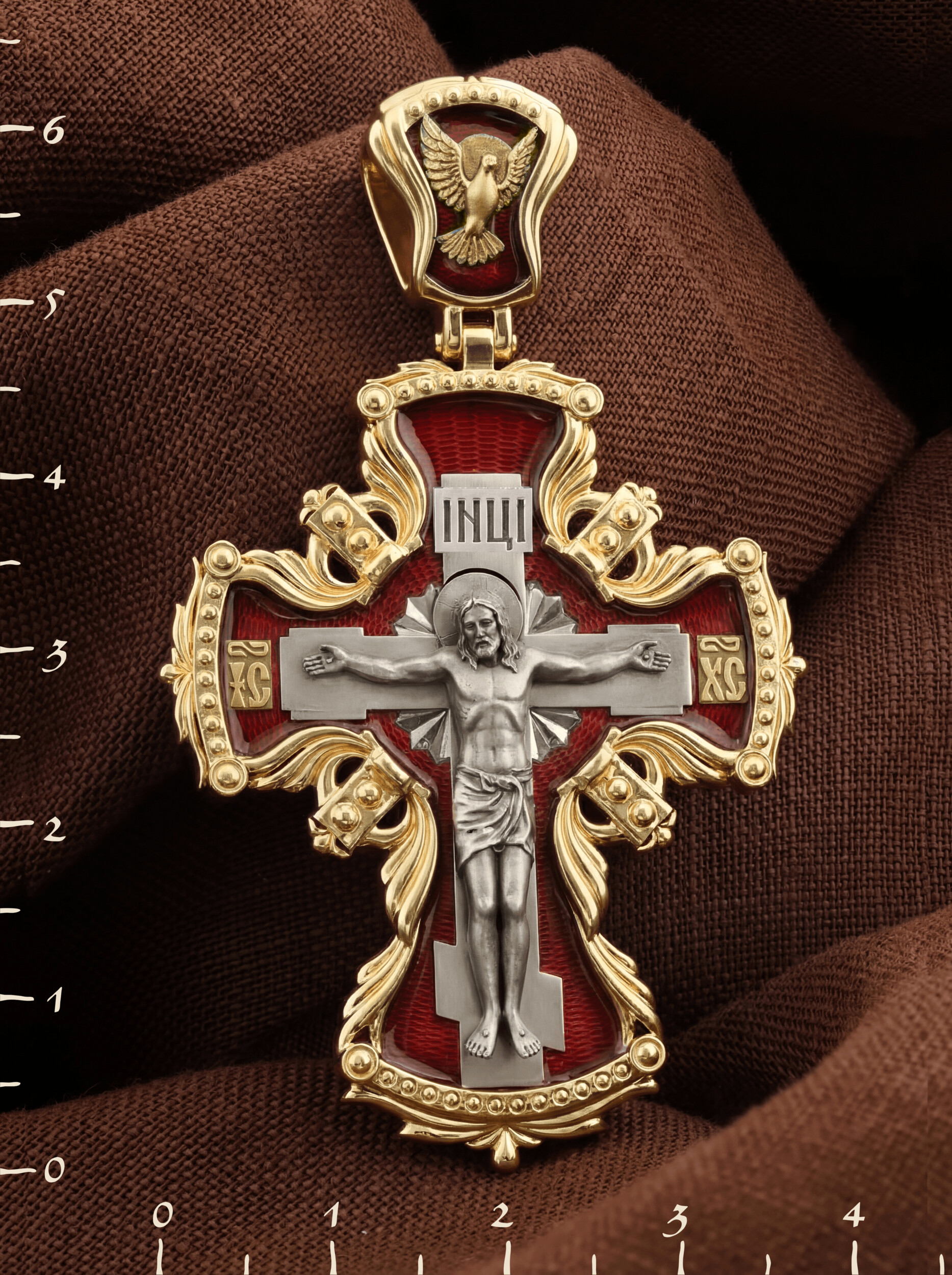Центральную часть лицевой стороны занимает Распятие Христа — образ жертвы, принесенной Господом за грехи людей. Именно ко Христу, сошедшему на землю ради нашего спасения, возносятся все молитвы. Рядом с Его образом помещены слова — «НИКА» и «СЫН БОЖИЙ». Эти слова характеризуют Господа как Великого Архиерея, победителя смерти. Также Распятие сопровождается надписями, олицетворяющими Христа — это святое имя Христа «IC» (Иисус) «ХС» (Христос). На кулонном кольце изображен голуь — символ Святого Духа.