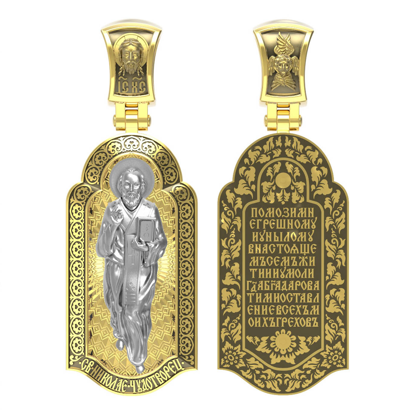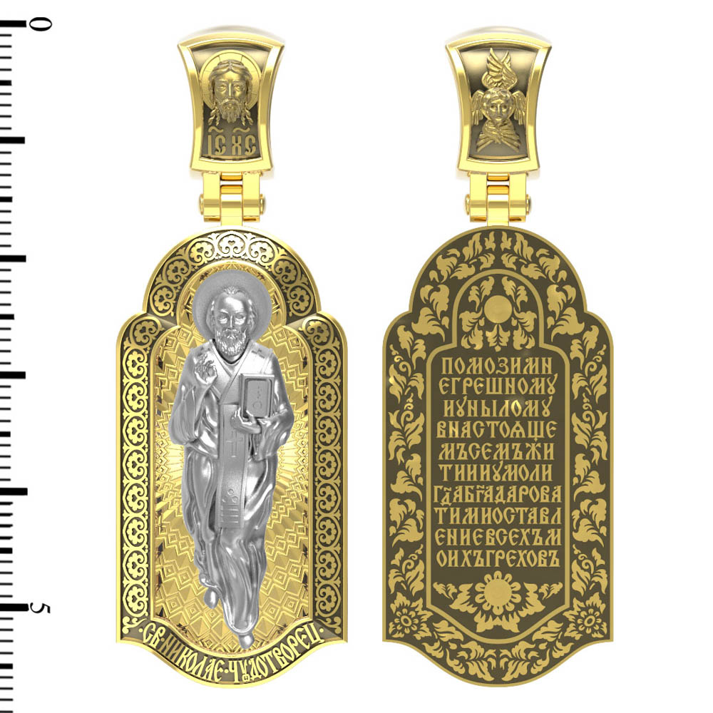 На лицевой стороне образка изображен Святитель Николай архиепископ Мир Ликийских, Чудотворец. Он является одним из самых почитаемых святых в православном мире. Избранник Божий Николай стал вершиной всех добродетелей. С кем из величайших праведников не сравнялся он образом духовной красоты, кому из них не последовал в своих деяниях и чудотворениях? Всеблаженный Николай был кроток, как Моисей, мужественен, как Давид, славен простотой нрава, как Иаков. Словно Ной, он спасал стадо Господне в новом ковчеге от потопа ересей. Вся жизнь святого Николая — это служение Богу. Много великих чудес сотворил на земле и на море великий Святитель Николай Угодник. Он укрощал штормы, спасал от потопления и выносил на сушу из глубины морской, освобождал из плена и приносил освобожденных домой, избавлял от уз и темницы, освобождал от смерти и подавал многим различные исцеления: слепым — прозрение, хромым — хождение, глухим — слух.