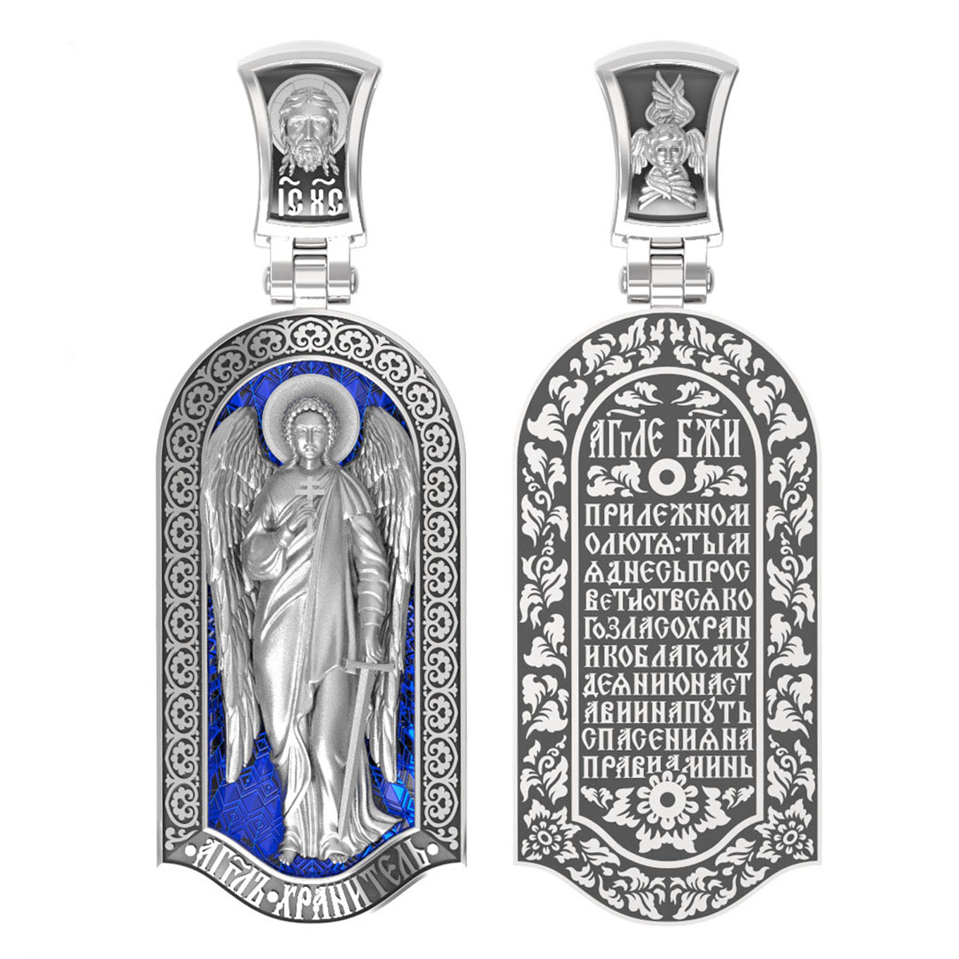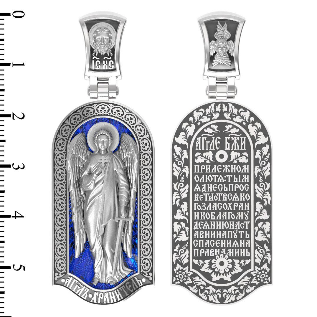 Основой композиции лицевой стороны является Ангела Хранителя. Образок Ангел Хранитель — это не просто украшение, а настоящая миниатюрная икона. В руках Ангел держит традиционные символические атрибуты Ангелов Хранителей: крест — знак послушания Христу и следования Его заповедям, меч — символ непримиримой борьбы, которую он ведет с бесами, отражая их нападения на людей. Слово «ангел» означает «вестник». Ангелы — верные служители Божьи, которых Господь посылает возвещать Свои повеления. Ангелы тварны, как и люди, но имеют другую природу. На иконах они изображаются в человеческом обличье с большими крыльями. Могучие крылья ангелов символизируют быстроту, с которой они исполняют повеления Бога, а небольшие ленточки у ушей –тороки, или слухи — показывают, что они всегда слышат Его голос.