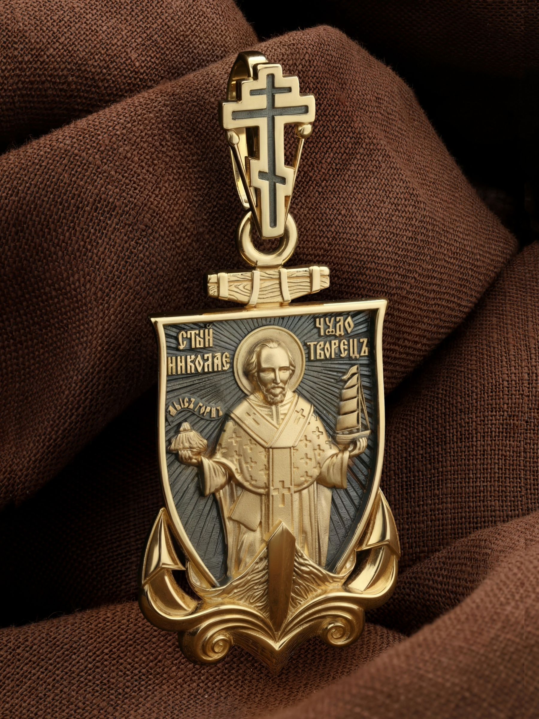 Лицевую сторону возглавляет икона Святителя Николая Чудотворца. Живший в III веке епископ Ликийского города Миры — самый почитаемый святой не только в России, но и во всем мире. Николай Чудотворец, помощник в делах, покровитель учащихся, утешитель обиженных и нуждающихся, целитель самых страшных и тяжелых недугов, предстатель и молитвенник за людей перед Богом. Также Святитель Николай Чудотворец известен своими молитвами за путешественников, когда непрестанный ветер и бушующие волны утихают и корабль заходит в спокойную гавань.