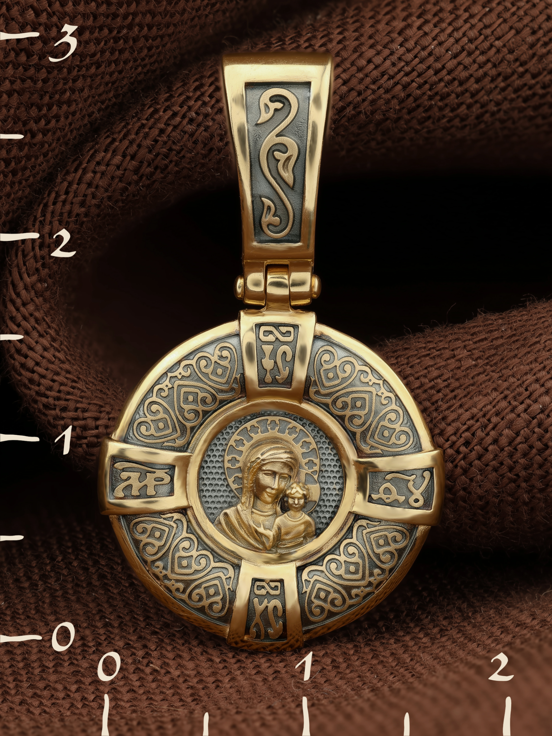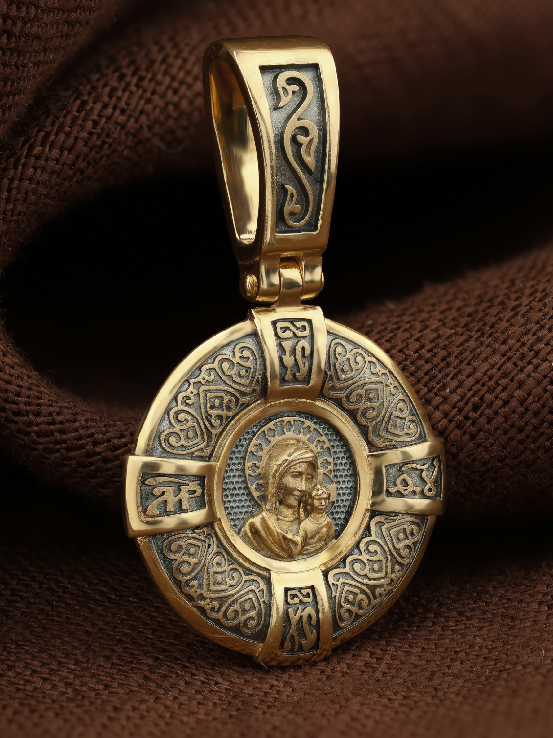 На лицевой части образка изображена Казанская икона Пресвятой Богородицы — одна из самых почитаемых в России чудотворных икон Богородицы. Богословское значение Казанской иконы — указать верующим истинный Путь к спасению, который лежит через Христа. Только Божия Матерь имеет настолько сильное дерзновение к Спасителю, что может ходатайствовать перед Ним за всех верных. Именно этот образ дарится новой повенчанной паре, как хранитель очага и семейная реликвия. Молитва перед Казанской иконой Божьей Матери помогает во всех сложных случаях жизни, в болезнях, во всех печалях, невзгодах, скорбях. Уникальная история появления, чудеса, случившиеся по молитвам православных людей возле образа — все это делает Казанскую Богородицу особенной, среди тысяч других икон.