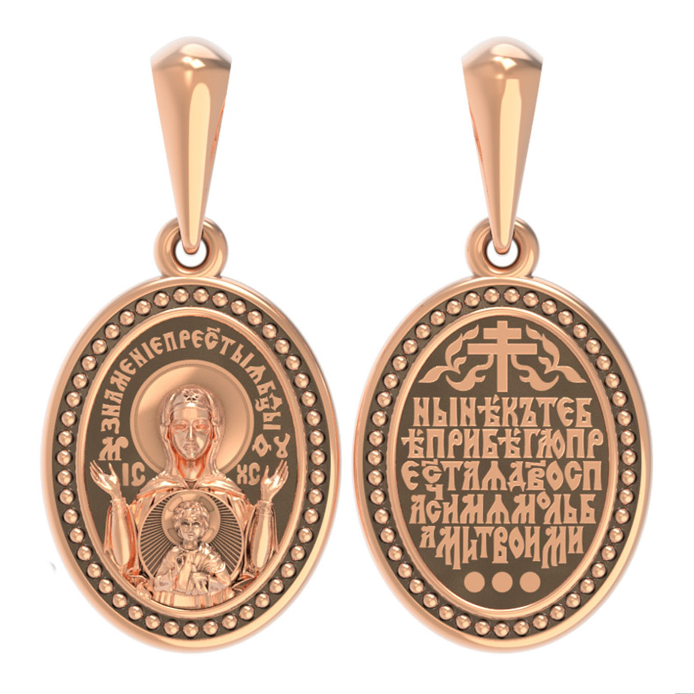 В центр образка помещен образ Божией Матери «Знамение», прославившийся многими чудесами в Новгороде в XII веке. Икона эта чтится как одна из самых великих святынь Русской земли. Молитвенно воздетые руки Богородицы означают заступничество за людей пред Богом. Рядом с Ней, на фоне круглого щита, — благословляющий Божественный Младенец — Спас-Эммануил.