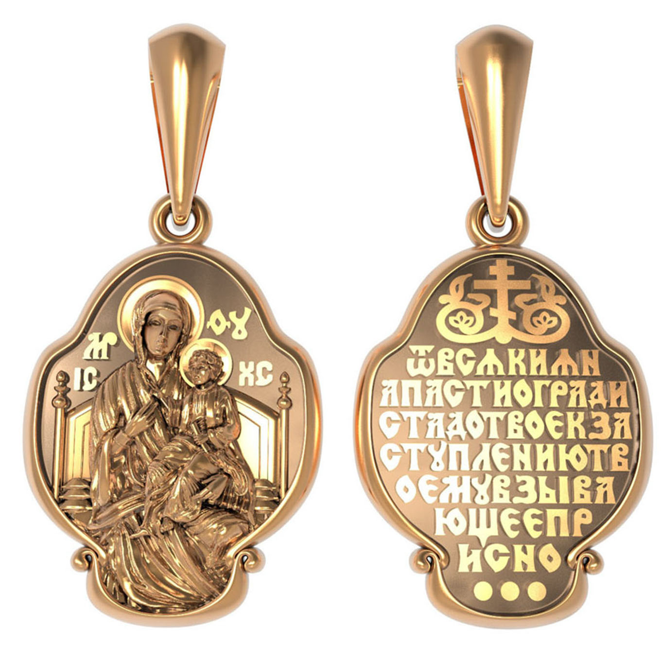На обороте образка написана молитва Богородице в честь Ее иконы «Всецарица» (Пантанасса): «От всякия напасти огради стадо Твое, к заступлению Твоему взывающее присно».