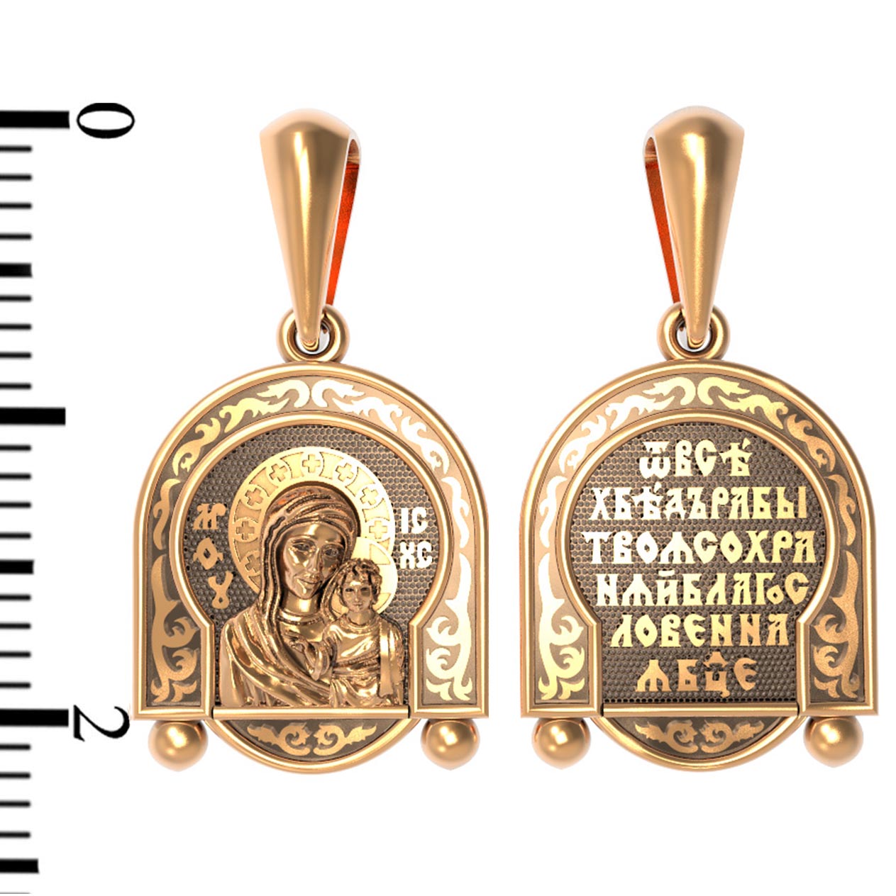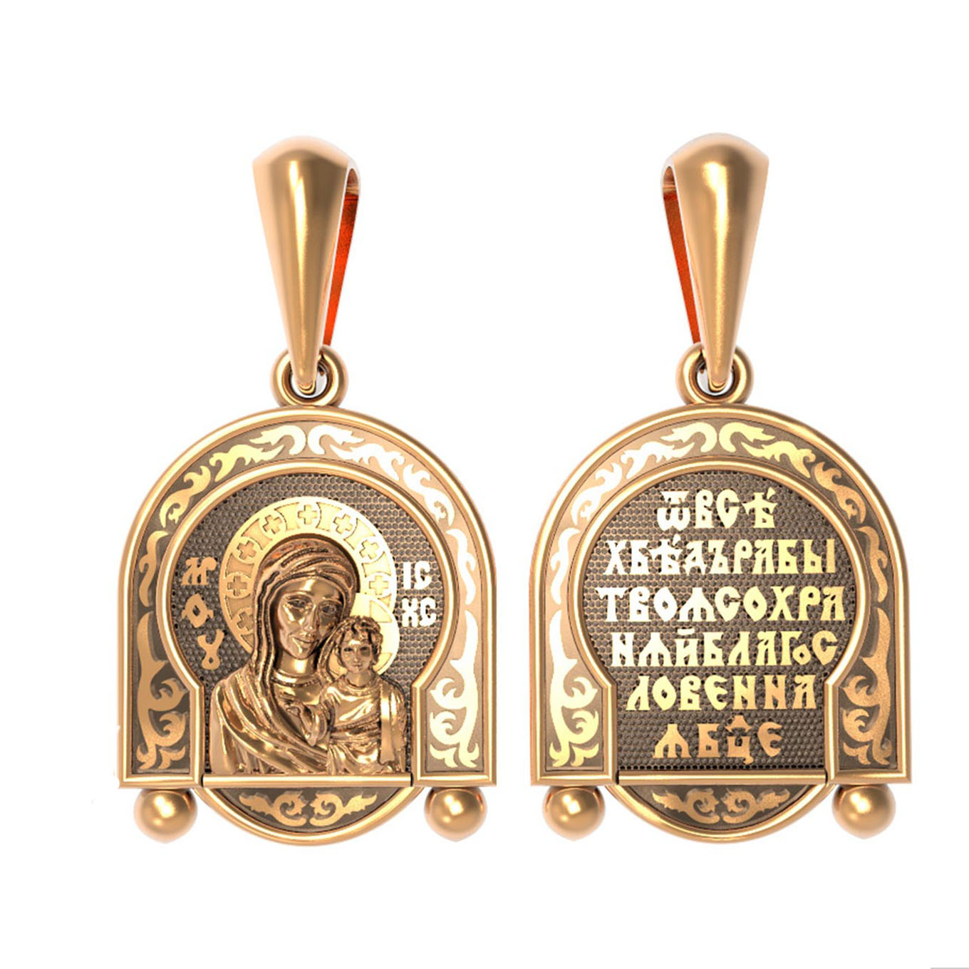 На лицевой части образка изображена Казанская икона Божией Матери — одна из самых почитаемых в России чудотворных икон Богородицы. Богословское значение Казанской иконы — указать верующим истинный Путь к спасению, который лежит через Христа. Только Божия Матерь имеет настолько сильное дерзновение к Спасителю, что может ходатайствовать перед Ним за всех верных. Именно этот образ дарится новой повенчанной паре, как хранитель очага и семейная реликвия. Молитва перед Казанской иконой Божьей Матери помогает во всех сложных случаях жизни, в болезнях, во всех печалях, невзгодах, скорбях. Уникальная история появления, чудеса, случившиеся по молитвам православных людей возле образа — все это делает Казанскую Богородицу особенной, среди тысяч других икон.
