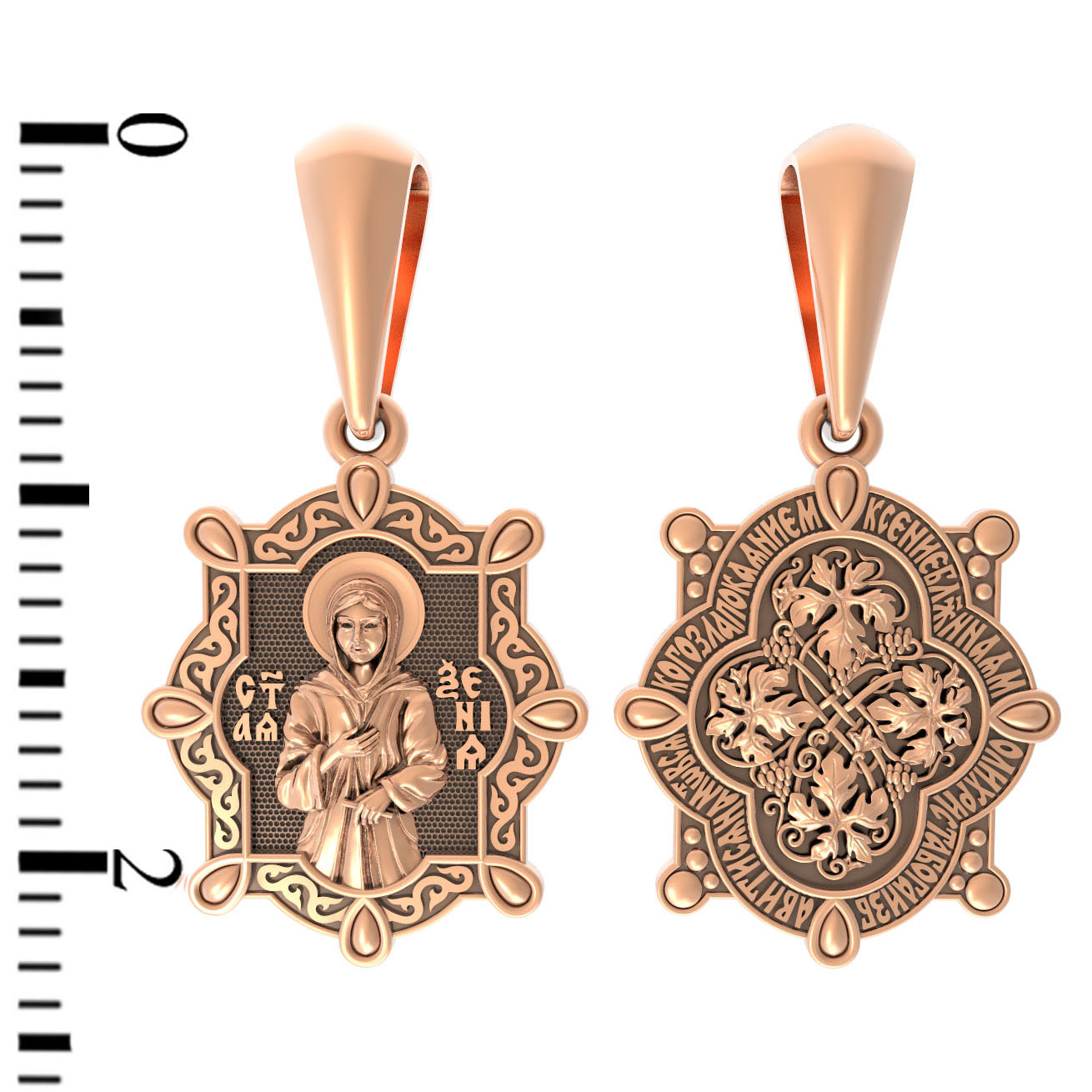 На лицевой стороне образка изображена Святая блаженная Ксения Петербургская, в миру Ксения Григорьевна Петрова.
