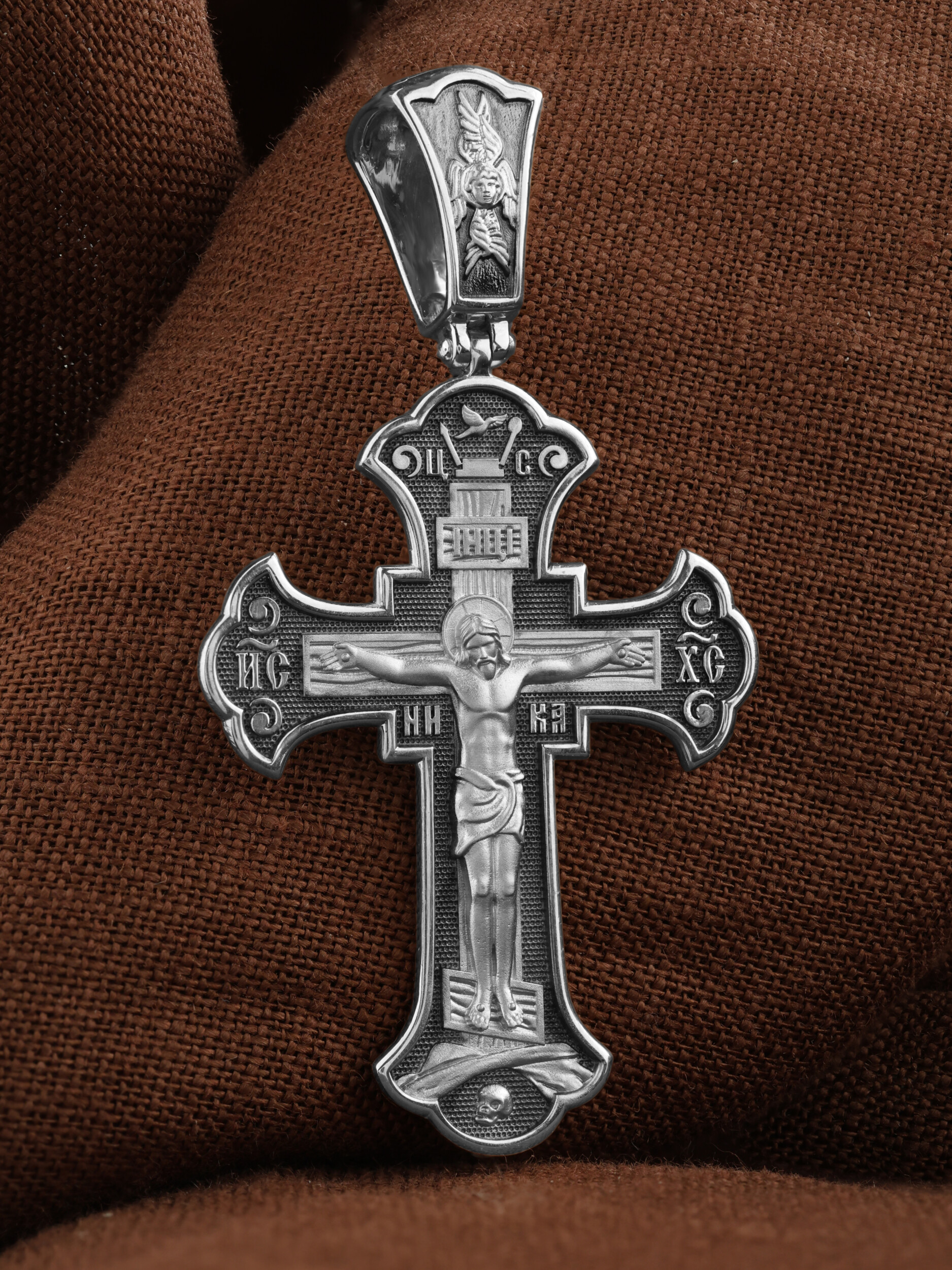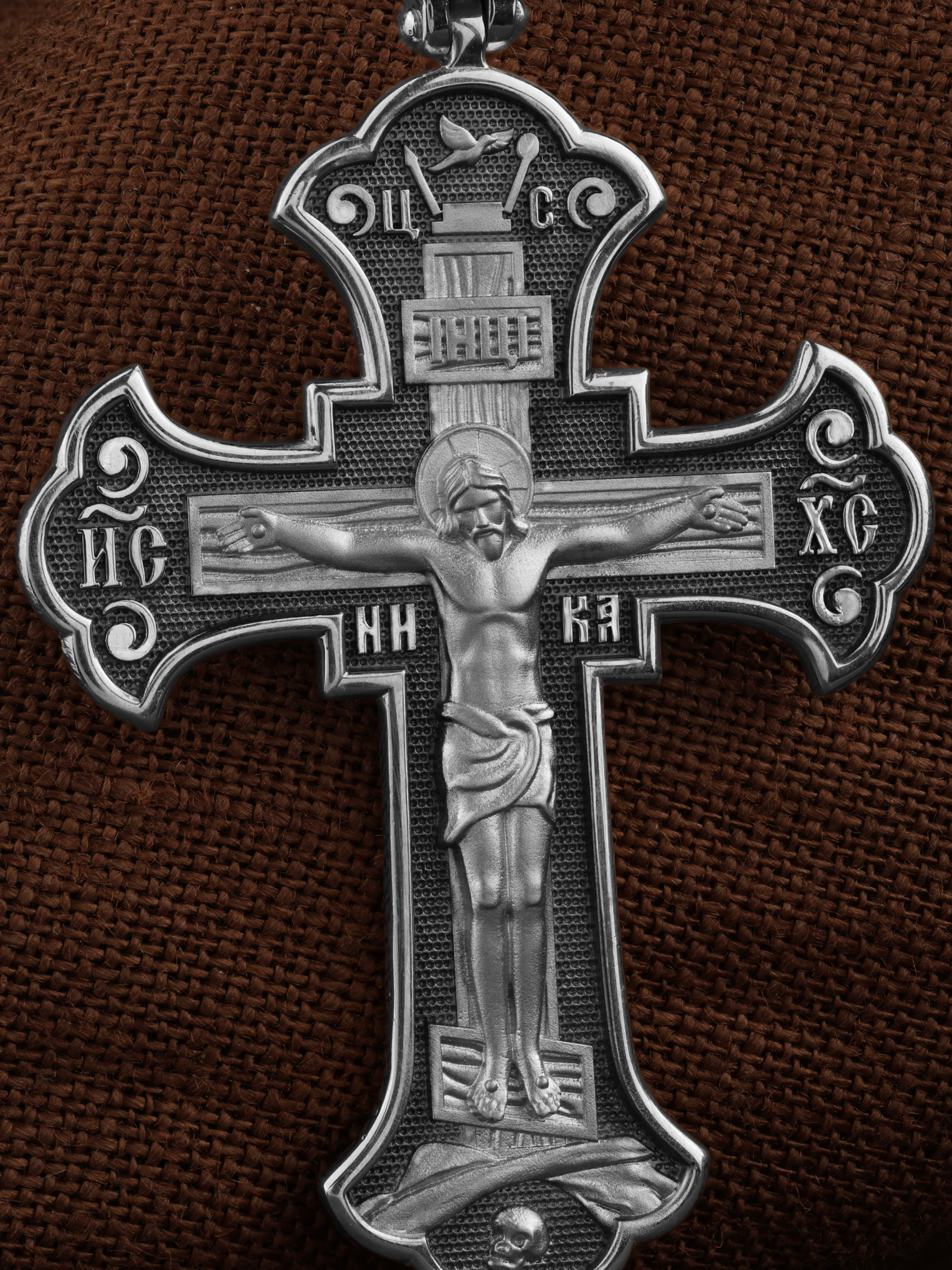 На лицевой стороне этого креста центральную часть занимает икона Распятия Христа — образ жертвы, принесенной Господом за грехи людей. Именно ко Христу, сошедшему на землю ради нашего спасения, возносятся все молитвы. Пресвятая Богородица, ангелы и святые — помощники Господа в деле спасения и заступники за людей перед Богом. «Оружием великим Христовым» именует Церковь крест, потому что, претерпев страдания и умерев, Господь победил смерть и лишил дьявола его власти над миром. Поэтому рядом с титлами Святого имени Христа написано «НИКА», что значит «победитель».