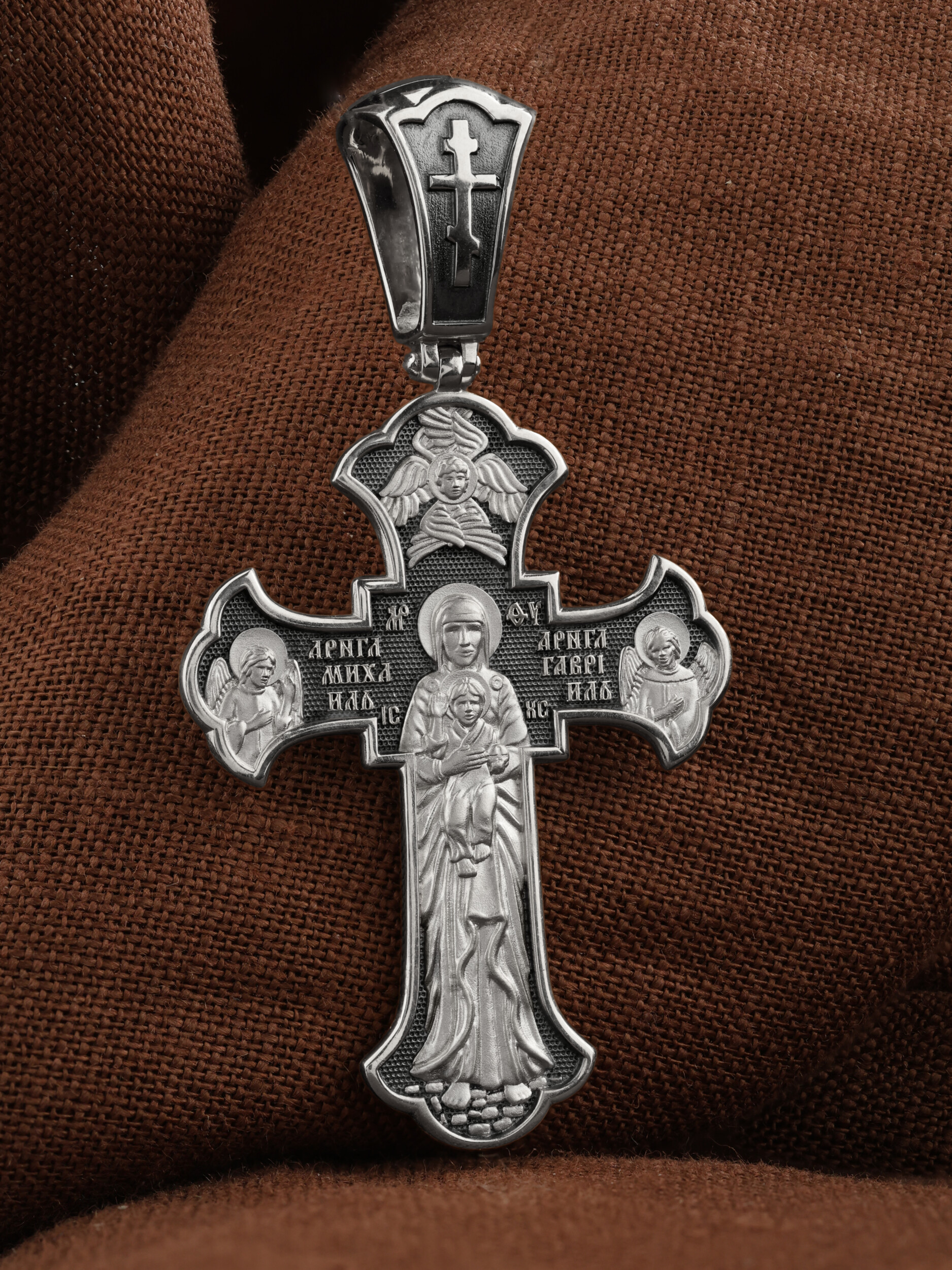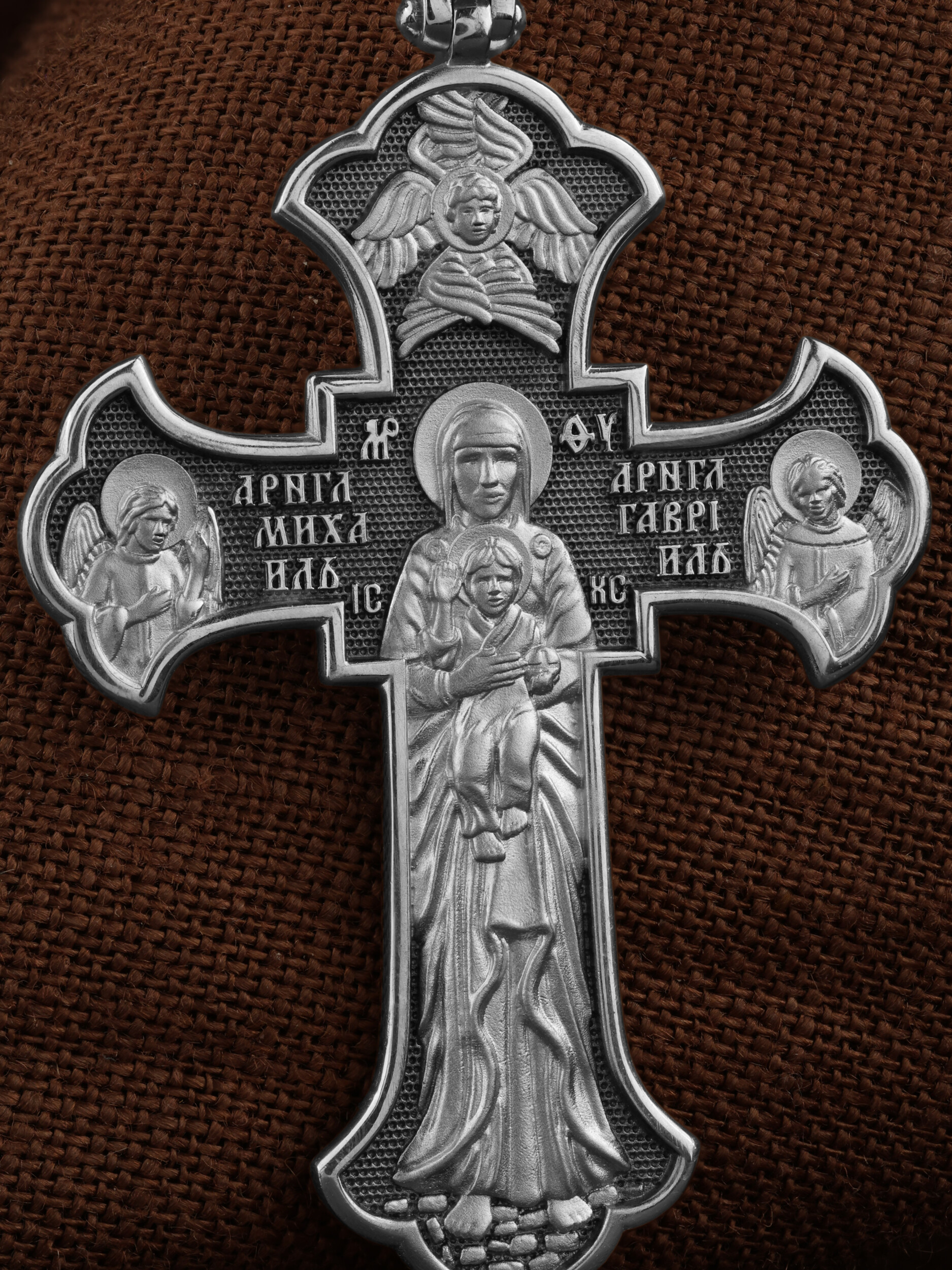 На обратной стороне креста в полный рост изображена Валаамская икона Божией Матери, над которой раскрыл свои крылья серафим. Этот образ написал в 1878 году иеромонах Валаамского монастыря о. Алипий. Валаамскую икону прославили многие чудеса, ее считают целительницей при разных недугах. Перед этим образом Богородицу молят в первую очередь об укреплении веры, просят даровать смирение, твердость в соблюдении заповедей Христовых и об исцелении. Богородице предстоят два архангела, Михаил и Гавриил.